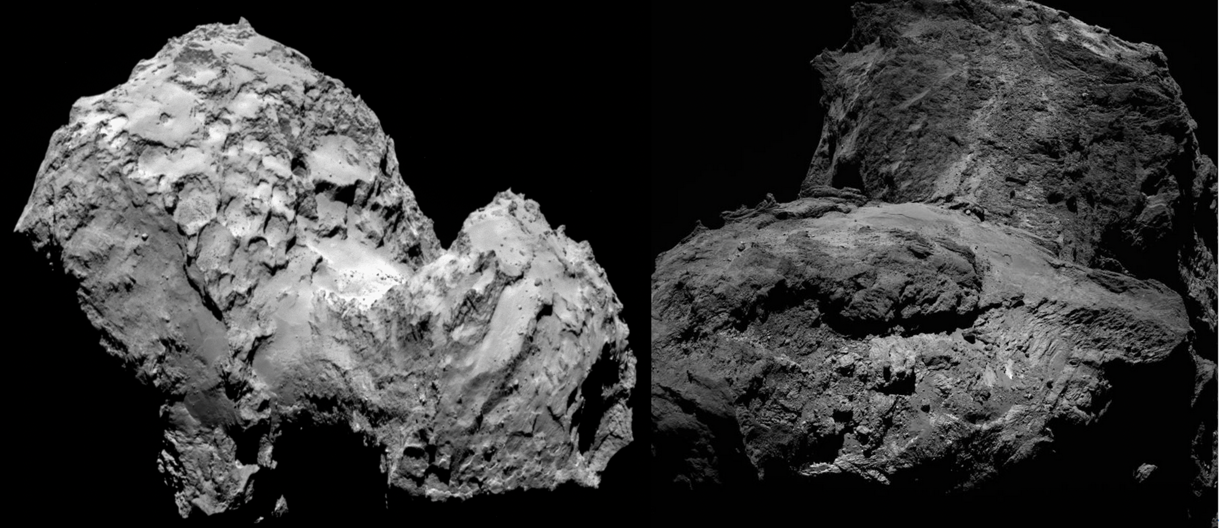 Figure 1: left: A view of the northern-hemisphere of the comet 67P/Churyumov-Gerasimenko. This image was captured by Rosetta's OSIRIS narrow-angle camera on 3 August 2014 from a distance of 285 km. Credit: ESA/Rosetta/MPS for OSIRIS Team MPS/UPD/LAM/IAA/SSO/INTA/UPM/DASP/IDA right: Clear view of on the southern hemisphere of the comet 67P/C-G taken on the 23rd of January, 2016, from a distance of about 76 km. Credit: ESA/Rosetta/MPS for OSIRIS Team MPS/UPD/LAM/IAA/SSO/INTA/UPM/DASP/IDA