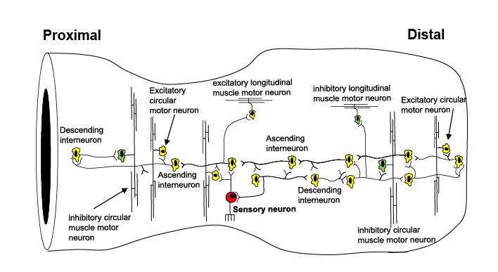 The findings in this study show that coordinated firing of many thousands of ascending and descending interneurons synaptically activate large populations of excitatory and inhibitory motor neurons, not only orally behind the bolus, but also over considerable distances downstream, ahead of the propagating contraction wavefront. This was a significant step forward because it means the temporal delay in onset of smooth muscle contraction ahead of a propagating contraction is due to the preferential aboral projections of inhibitory motor neurons, which, when active, suppress the smooth muscle excitation by the concurrently active excitatory motor neurons (Fig.1). The electrophysiological recordings made concurrently with the spatio-temporal D-mapping showed pulsatile firing of excitatory and inhibitory neuromuscular inputs not only in proximal colon, but also distal colon, long before the propagating contraction invades the distal region (Fig.1). During the propulsion of fluid along the isolated colon, wavelet analysis showed there was increased coherence of excitatory junction potentials occurring at ~2Hz over large distances, between the proximal and distal regions (Fig.1). Therefore, during propulsion, synchronous firing of descending inhibitory nerve pathways over long ranges aborally acts to suppress the smooth muscle from contracting, counteracting the excitatory nerve pathways active over this same region of colon (Spencer, 2021).