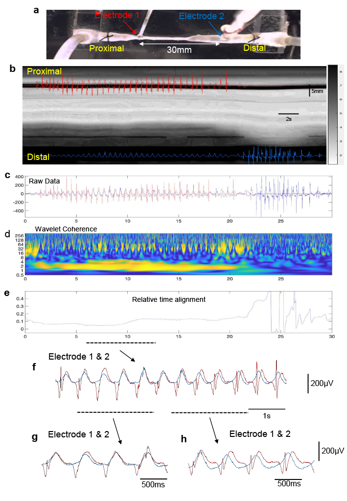 As mentioned above, from an evolutionary perspective the ENS is the first brain, as it evolved before the CNS (Furness and Stebbing, 2018, Spencer et al., 2018, Spencer and Hu, 2020). The ENS represents a primeval hard-wired neural control system, which, when active is essential for neurogenic propulsion along the colon. Our work reveals a unique feature of the ENS of the colon that underlies both non-propulsive and propulsive motor patterns. The study demonstrates the existence of large functional assemblies of neurons in the ENS that can self-organise to generate coordinated firing considerable distances along the colon (Fig.2). This activity underlies the basis of an important motor pattern in the colon. The findings uncovered here are far more complex than we expected and considerably different from the mechanisms that underlie the propulsion of fluid along other hollow smooth muscle organs that have evolved without an intrinsic nervous system; like in lymphatic vessels, ureters or the portal vein. Synchronization of neuronal activity across large populations of neurons is common in the nervous system of many vertebrate animals. This study shows that the ENS behaves similar to other complex neural networks in the brain and spinal cord of other species.