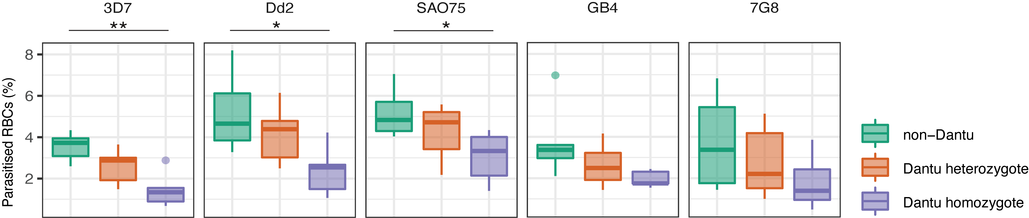 Reduced invasion of five P. falciparum parasite strains into Dantu red blood cells