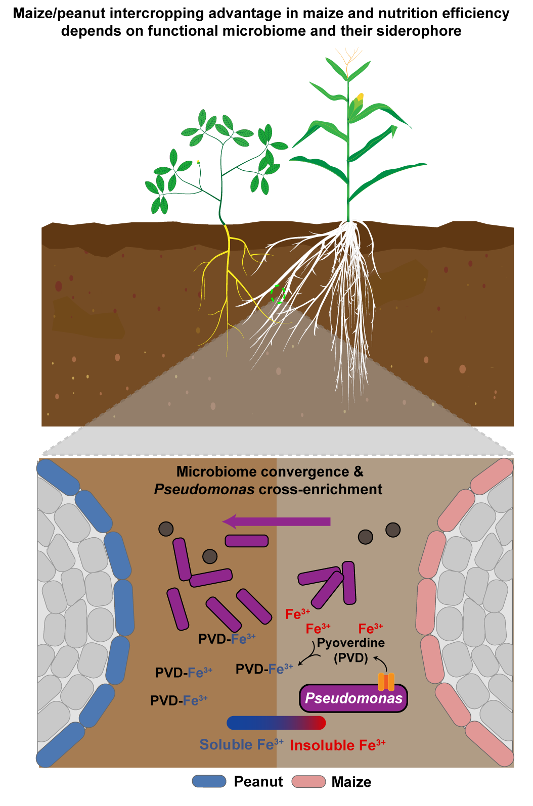 Since 2000, it is known that peanut/maize intercropping improves iron nutrition via direct belowground facilitation involving root exudates1-4 (Fig. 1). Higher plants show two alternative iron deficiency-induced molecular and physiological responses1-3. Peanut follows strategy I (dicots and non-graminaceous monocots) and directly reduces Fe(III) to Fe(II), followed by Fe(II) absorption1-3. In contrast, maize follows strategy II (graminaceous monocots) and secretes phytosiderophores of the mugineic acid family (MAs) to chelate insoluble Fe(III) followed by MAs-Fe(III) complex absorption1-3. Maize outperforms peanut in iron acquisition in alkaline soils because strategy II is less sensitive to high pH1-3. It was proposed that intercropping benefits peanut because it enhances deoxymugineic acid (DMA) secretion from maize root, which solubilizes more Fe(III) in the soil and is then absorbed as DMA-Fe(III) complex by nearby peanut plants3-4. However, this current plant-plant interaction model for iron utilization does not integrate interactions of plants with the root-microbiome. We hypothesize that peanut/maize intercropping could modulate the rhizosphere microbiome through the proximity of plant roots, which in turn could promote the mixing of root exudates, microbiome members, and their iron-chelating siderophores and thus improve iron acquisition opportunities.