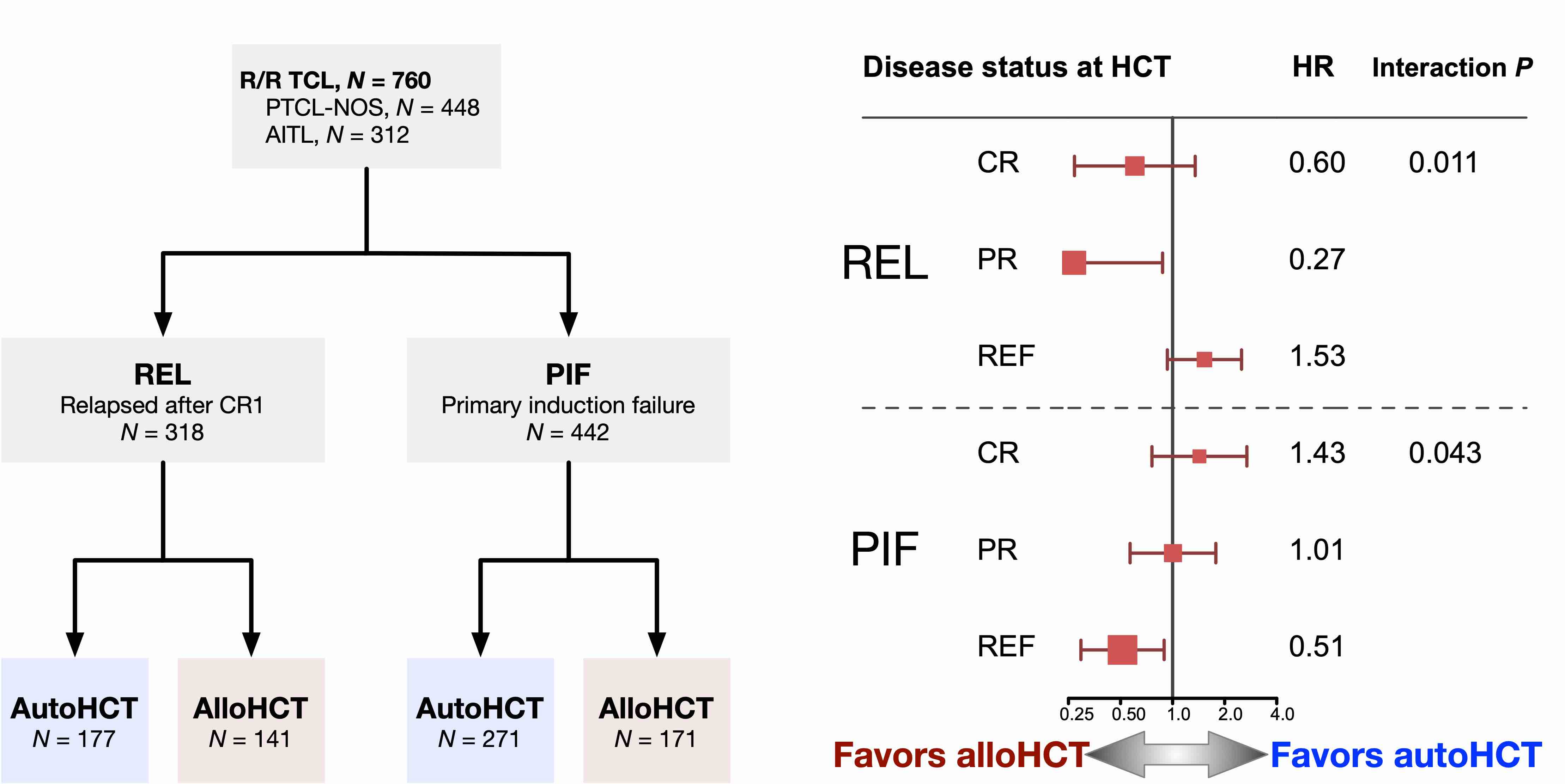 Several retrospective studies have compared the role of autoHCT and alloHCT for TCL [1–4]. Because these studies included patients with various levels of chemosensitivity in both upfront and salvage settings, the type of HCT that should be applied for patients with R/R disease remains to be elucidated.