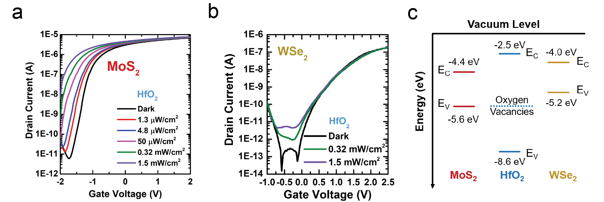 In this study, we investigated how to design a dominating photogating or photoconductive effect with TMDC-based phototransistors. The photoconductive effect can provide fast light switching speeds due to collection of photogenerated carriers and the photogating effect can provide high light sensitivity due to photocarrier charge trapping. Although many works have reported photogating behavior for TMDCs, this behavior as a dominating photocurrent generation mechanism is observed in the accumulation mode only. Here, we explored how the dielectric layer properties can directly influence the photocurrent generation process. High-k metal oxides such as hafnium oxide (HfO2) are well known charge trapping materials which are used in some memory applications. We found that the intrinsic oxygen vacancy defects located in the mid band gap region of HfO2 offers trap energy level alignment with the valence band edge of MoS2. As a result, the photogenerated holes tunnel into the HfO2 dielectric layer to occupy these defect levels enabling a strong photogating behavior as seen in the figure 1(a) below. By providing a trap energy level misalignment, a strong photoconductive effect can be observed with the WSe2 device in figure 1(b) using the same HfO2 dielectric. The band energy diagram of MoS2, WSe2, and HfO2 in figure 1 (c) illustrates the valence band alignment with these oxygen vacancies.