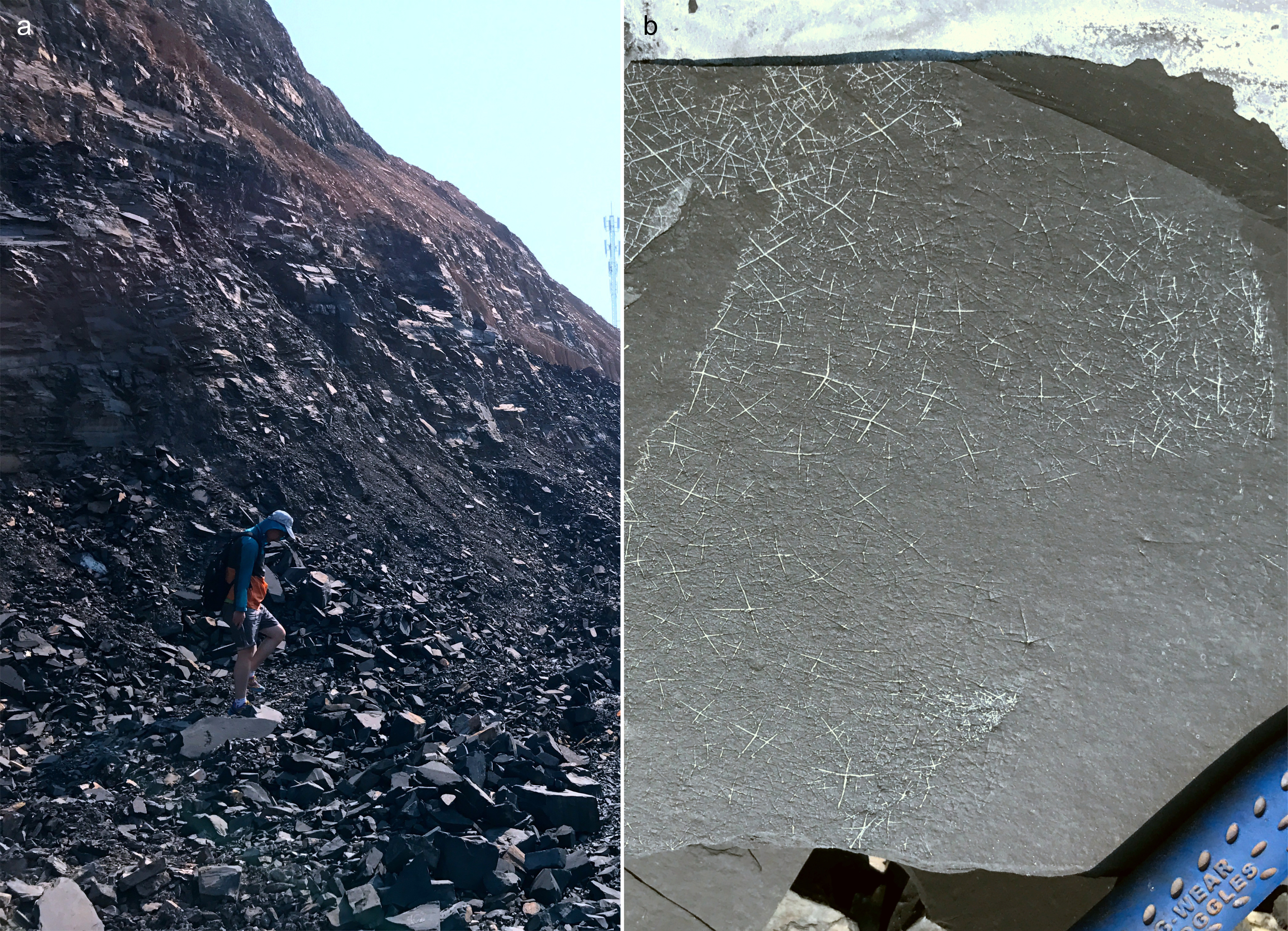 Fig. 1. An early Cambrian quarry in South China (a) where abundant sponge spicules (b) have been found.