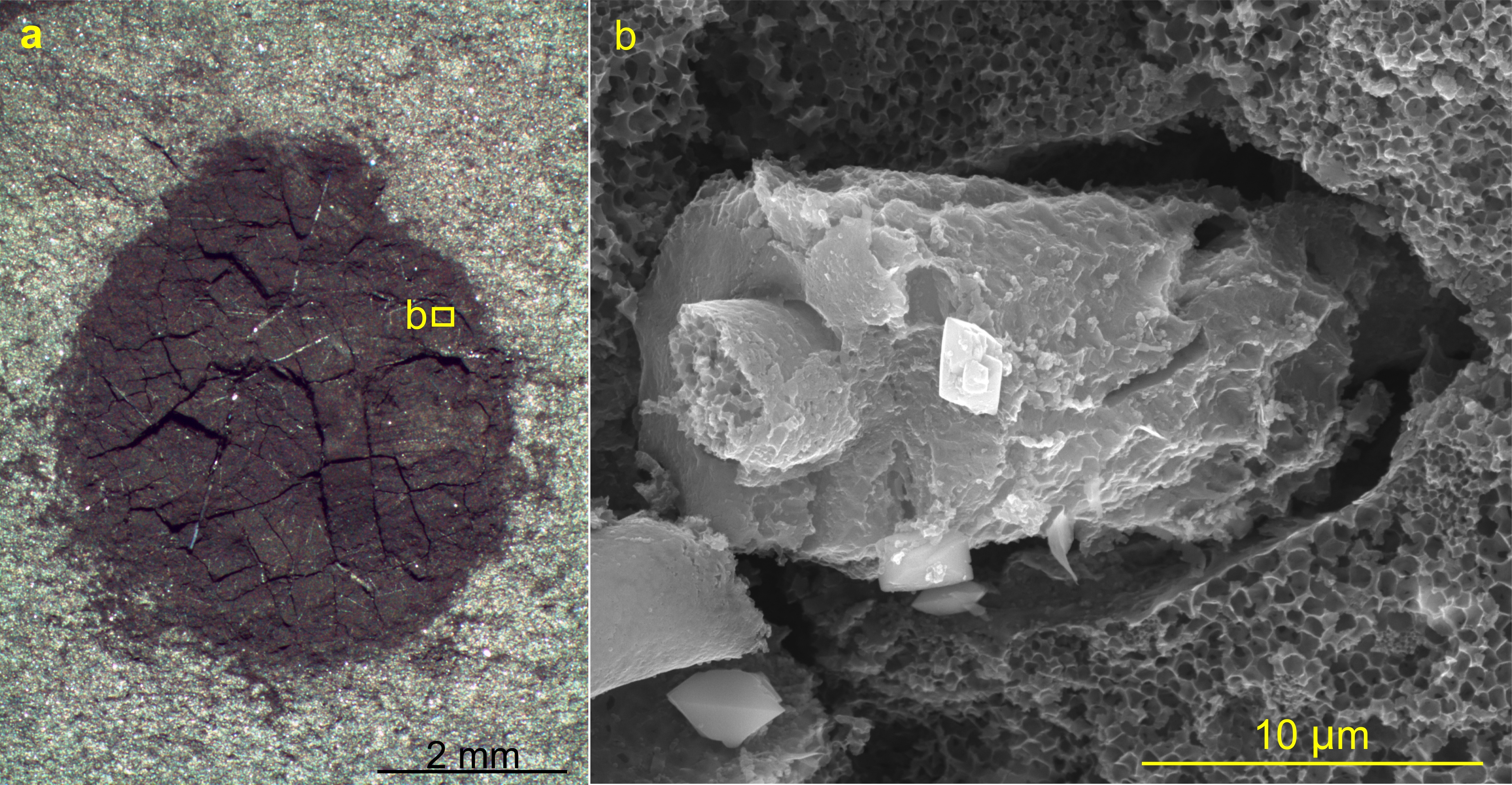 Fig. 2. Small sponge fossils (a) with weakly biomineralized spicules (b). The spicule shown here is demineralized by geological processes so that what is remaining now is organic material and what used to be biomineralic material is represented by a narrow gap.