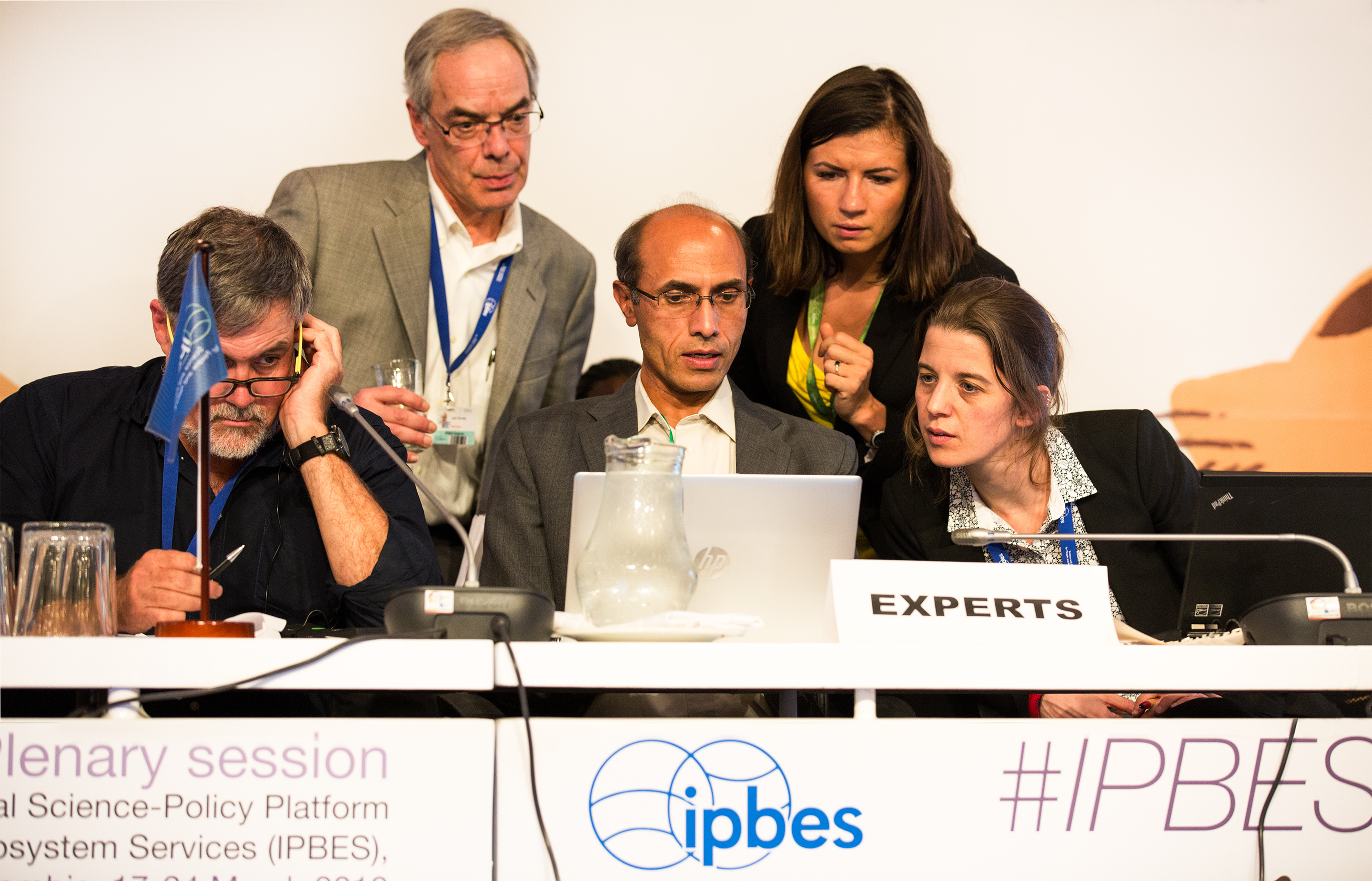 Authors discussing issues raised during IPBES Plenary that approved the Land Degradation and Restoration Assessment in Medellin, Colombia, May 2018. Photo by IISD/ENB | Diego Noguera