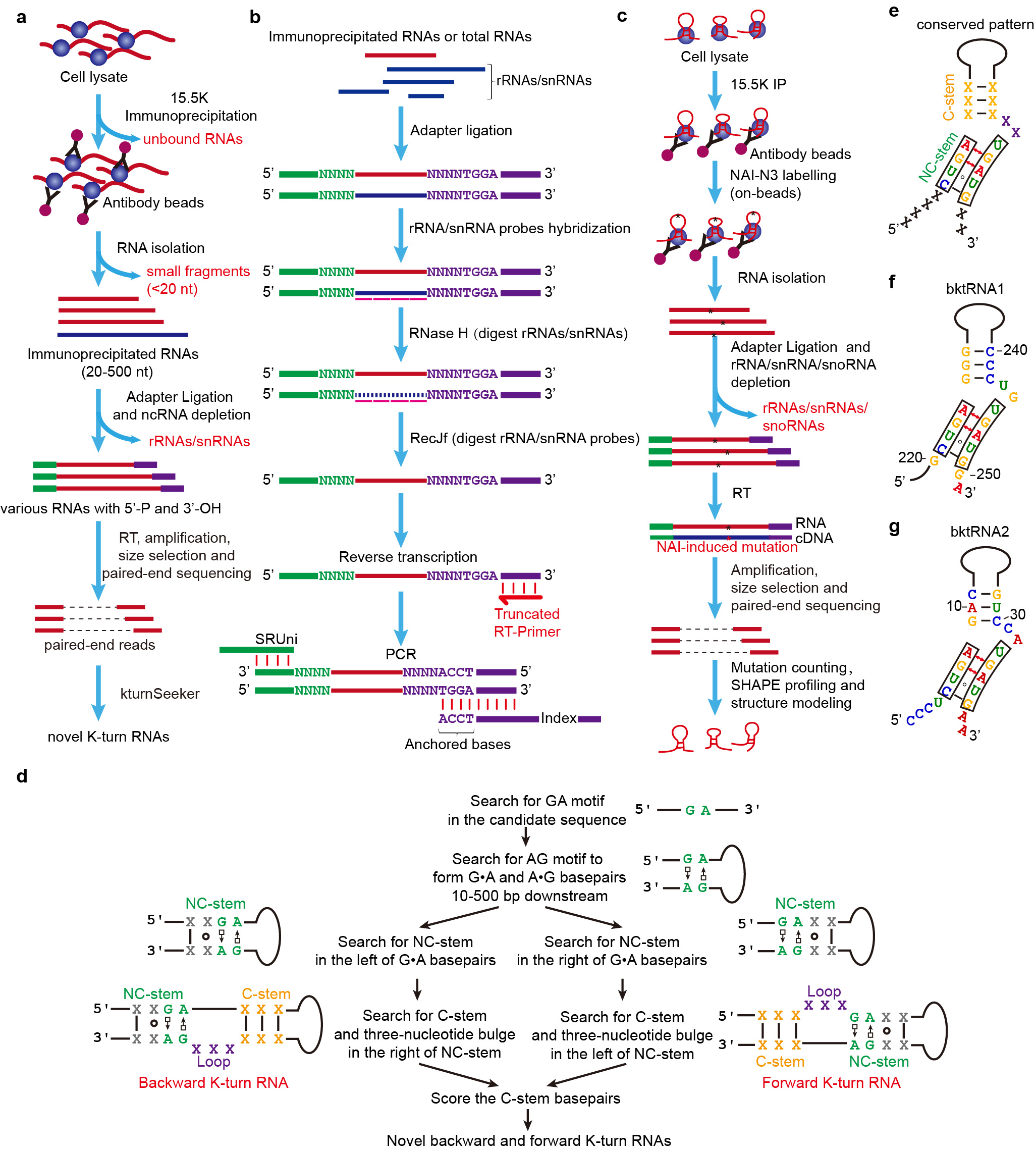 Fig. 1 | New experimental and computational methods for identifying kink-turn RNAs. a, Procedure for the construction of RIP-PEN-seq libraries. b, Diagram of RNase H-based rRNAs/snRNAs depletion for the construction of RIP-PEN-seq or PEN-seq library. c, Workflow for the construction of 15.5K RIP-PEN-SHAPE-MaP libraries. d, KturnSeeker core algorithm workflow. KturnSeeker was developed to identify and quantify forward (fktRNAs) and backward ktRNAs (bktRNAs) from RIP-PEN-seq data. e, Gene model of bktRNA identified from RIP-PEN-seq data. f, The predicted secondary structure of the bktRNA1. g, The predicted secondary structure of the bktRNA2.