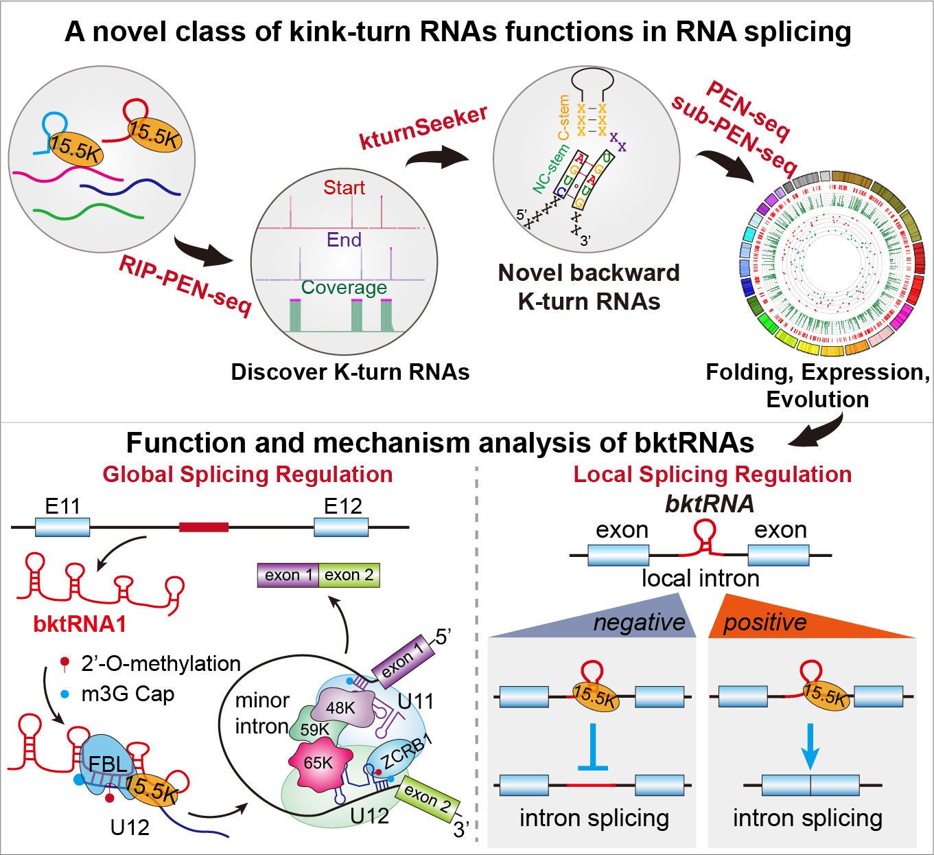 Fig. 2 | The workflow illuminating how to identify a novel class of ncRNAs with consensus backward K-turn structural motifs (upper panel). Proposed model showing the functions and mechanisms of bktRNAs (bottom panel).