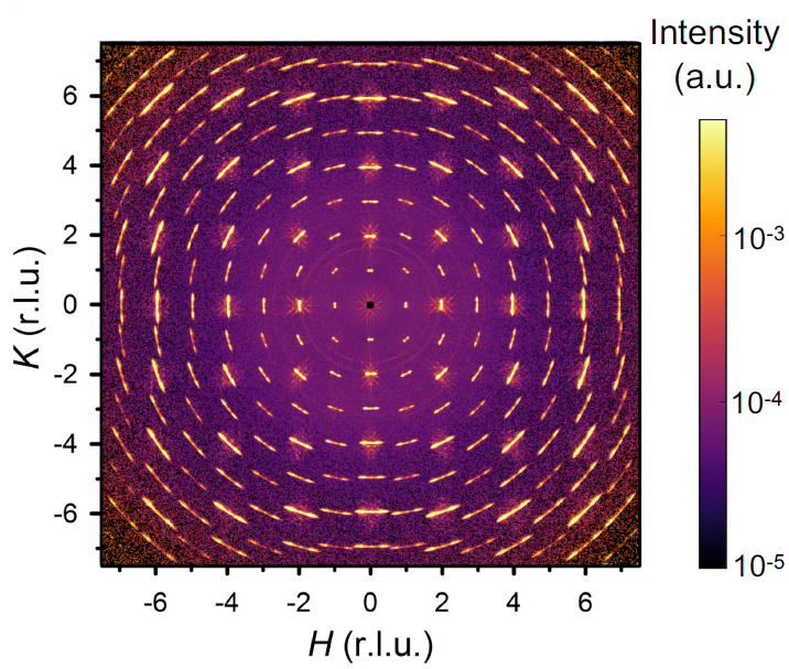 As described in our new paper in Nature Materials, the effects are substantial. First of all, plastic deformation causes only a modest increase in the number of dislocations in STO. Instead, the main structural effect is that the dislocations self-organize into large periodic structures known as dislocation walls. We managed to observe these using neutron scattering and X-ray, yielding some rather pretty pictures (figure 2). Around the walls, the electrical properties of the material change, and we believe that this leads to the observed superconductivity enhancement. In addition to the clear, roughly factor-of-two increase of Tc in deformed samples, there are also tantalizing signs of superconducting correlations at temperatures two orders of magnitude higher than that!