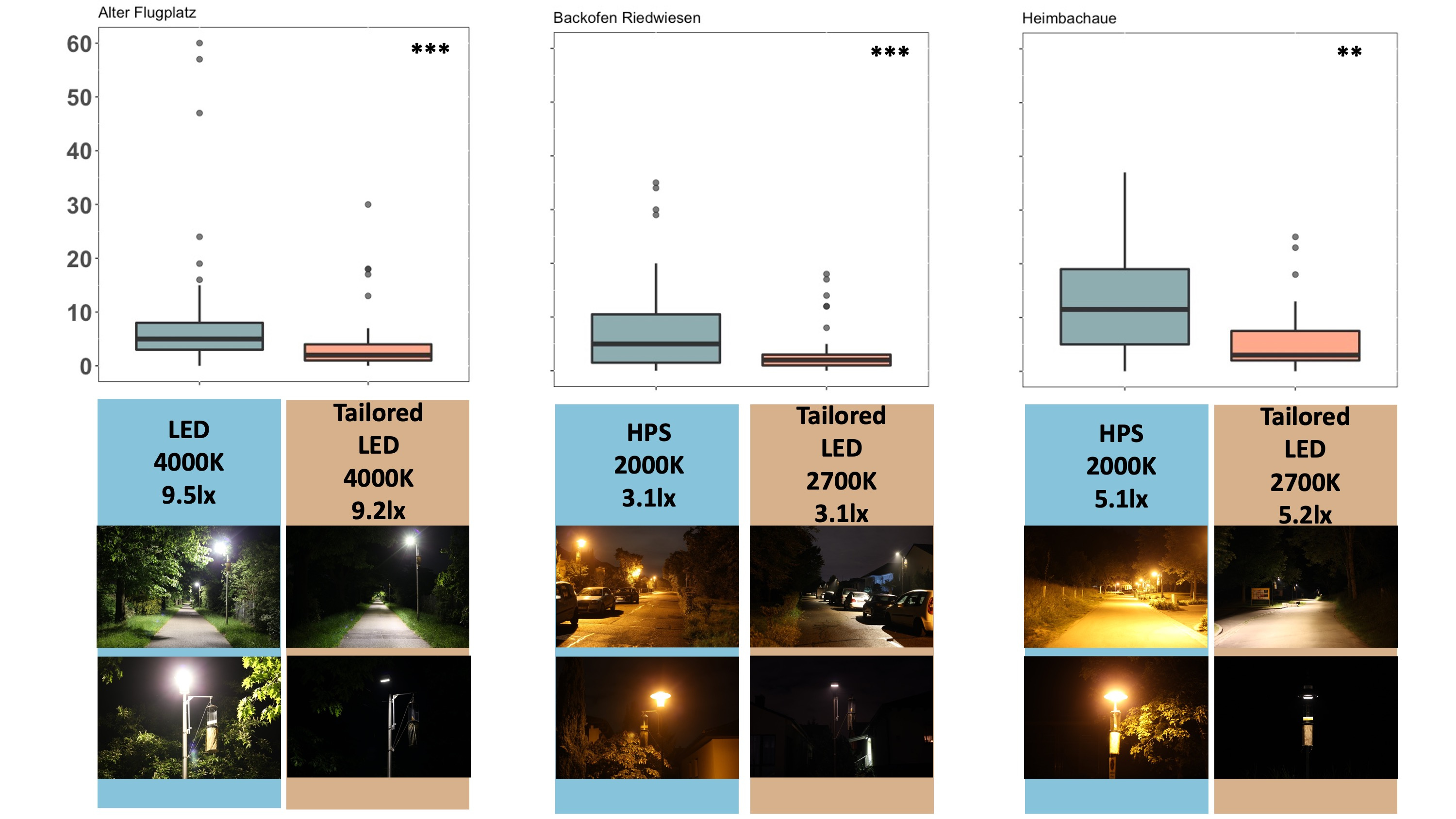 Funding was provided through two projects. “Species protection through environmental friendly lighting” (AuBe) is funded within the Federal Programme for Biological Diversity by the Federal Agency for Nature Conservation (BfN) with resources from the Federal Ministry for the Environment, Nature Conservation, Nuclear Safety and Consumer Protection (BMUV; FKZ: 3518685A-H08) and “NaturLicht” funded by the “Sonderprogramm zur Stärkung der biologischen Vielfalt” in the federal state of Baden-Württemberg and funded by the regional council (Regierungspräsidium) Karlsruhe.