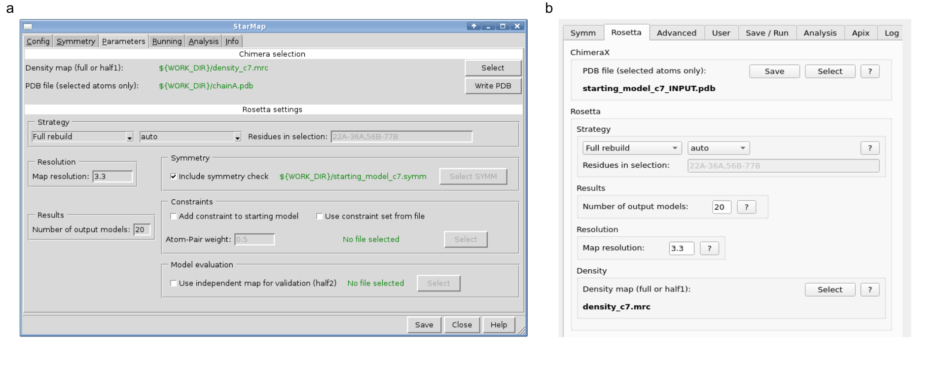 Conceptually, StarMap serves as an interface between Rosetta and the end user. The user wants to find the precise coordinates of atoms in space - like stars in the universe – and the program serves as a guide (“the star map”). The tricky parts of the Rosetta modelling workflow are happening under the hood, while the user only makes the essential choices: point to the file locations, select the regions for modelling, decide whether to use an HPC or run locally on a laptop. Molecular modelling is unimaginable without looking at the input maps and obtained models, so the obvious choice was to write StarMap as a plugin for UCSF Chimera8. For a long time Chimera was the go-to software when analysis and visualization of electron microscopy data was required. This also meant that most end users of StarMap are familiar with Chimera. Finally, the software architecture of Chimera made writing plugins fast and straightforward.