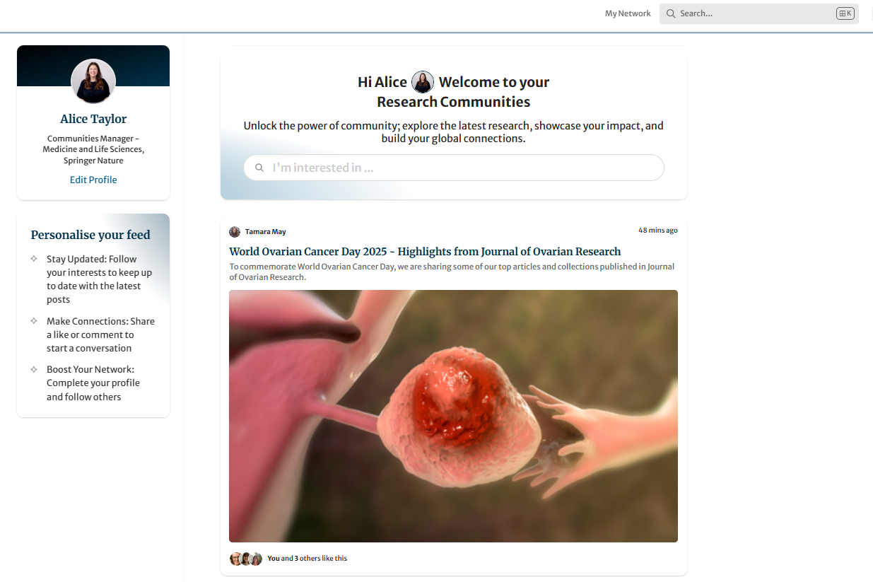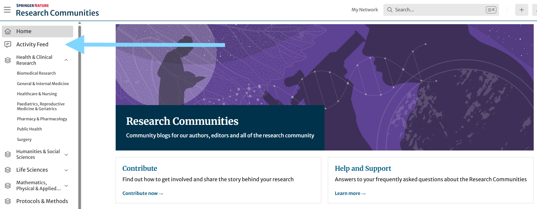 You can find the Activity Feed at the top of the left-hand panel on the Research Communities or head to communities.springernature.com/activity. Simply log in, and your personalised feed will be ready to explore.