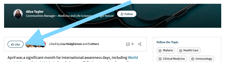 - Share a like or comment on a post published in the Research Communities to start a conversation and grow your network and Activity Feed.