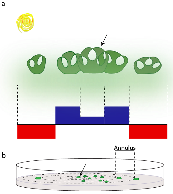 Figure 3: Adapted from [4], Figure 3. (a) Cartoon describing spatial kernels as identified in arid ecological systems. The growth of a focal individual (black arrow) can be influenced by its surrounding environment. (b) Cartoon depicting a spatial kernel framework in a microbial CFU experiment. Black arrow indicates a focal colony.