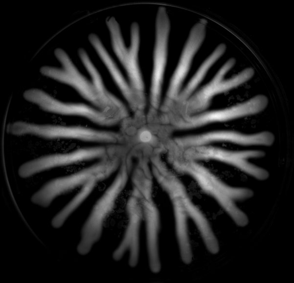 Rhamnolipids themselves are virulence factors, and when produced in massive amounts they allow P. aeruginosa to cooperatively swarm. Swarming allows the cells to move centimeters from their starting location in a matter of hours in beautiful dendritic patterns (Figure 1). Interestingly, despite the large amount of resources required to secret enough rhamnolipids to swarm, this behavior in P. aeruginosa appears to be un-cheatable. In any swarming competition, when these cooperators are pitted against a rhamnolipid non-cooperator, they never seem to lose.