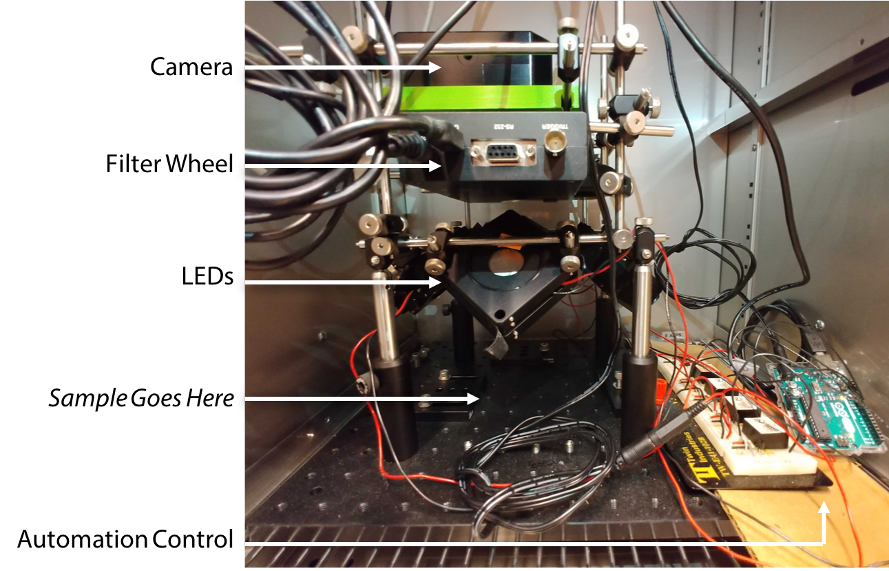 The demands of tracking microbial gene expression both through time and space required us to build a new fluorescent imaging system (Figure 2). LED light was used to illuminate the samples. Images were collected by a fluorescent camera through a filter wheel. The hardware infrastructure was constructed inside an incubator to allow for cellular observation with temperature control. We wrote custom software to automate image collection and to process the image timeseries, extracting information about the cells with pixel-level resolution. The system generated image timeseries that we analyzed for cell growth and gene expression patterns.