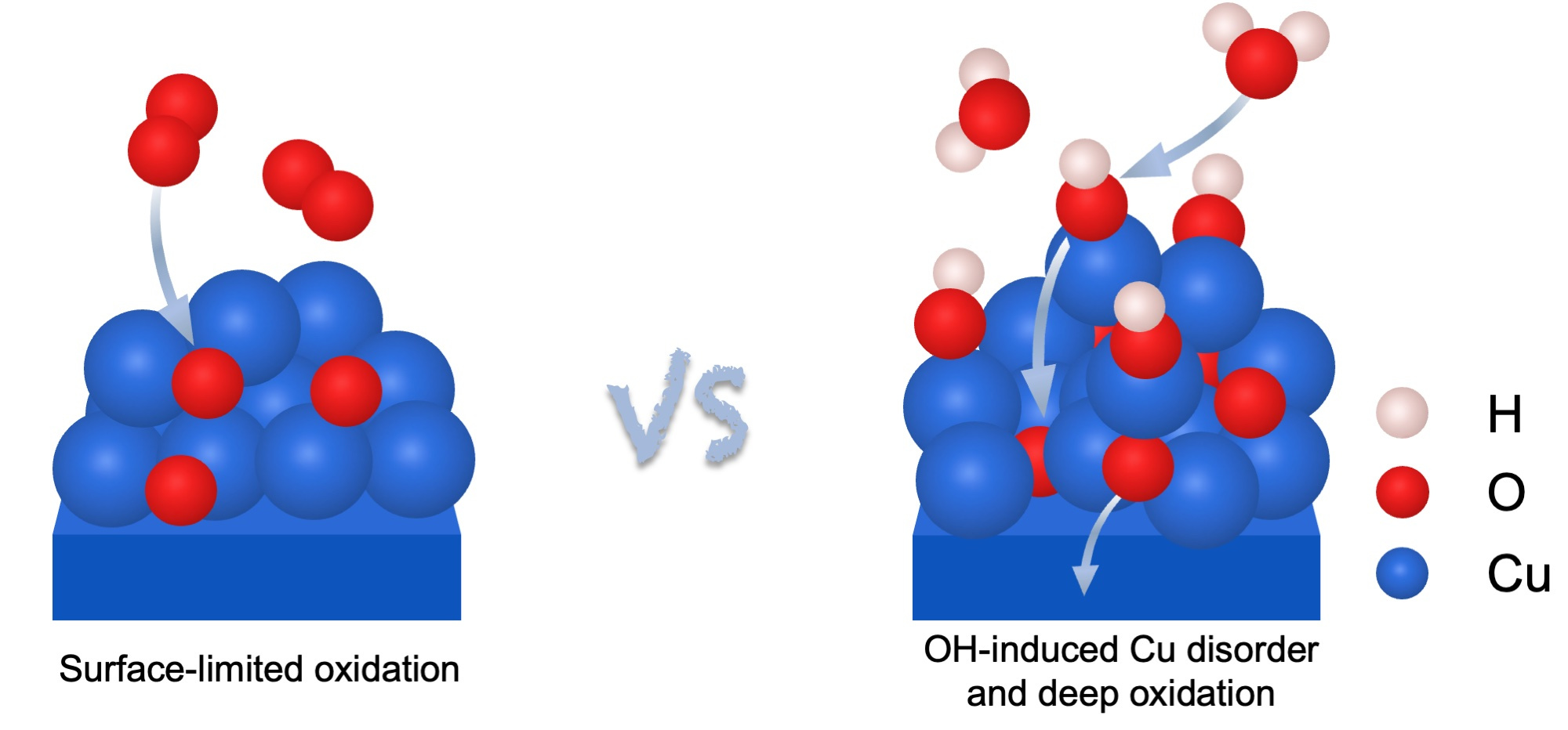 At first glance, oxidation in humid air seems easy to explain: oxygen reacts with the metal, and water accelerates the process. However, when oxygen and water are both present, their reaction pathways overlap, which makes it difficult to determine whether water is merely present during oxidation or actively changing how it proceeds.To disentangle these effects, we compared copper oxidation under two controlled environments: dry oxygen and a mixture of oxygen and water vapor.