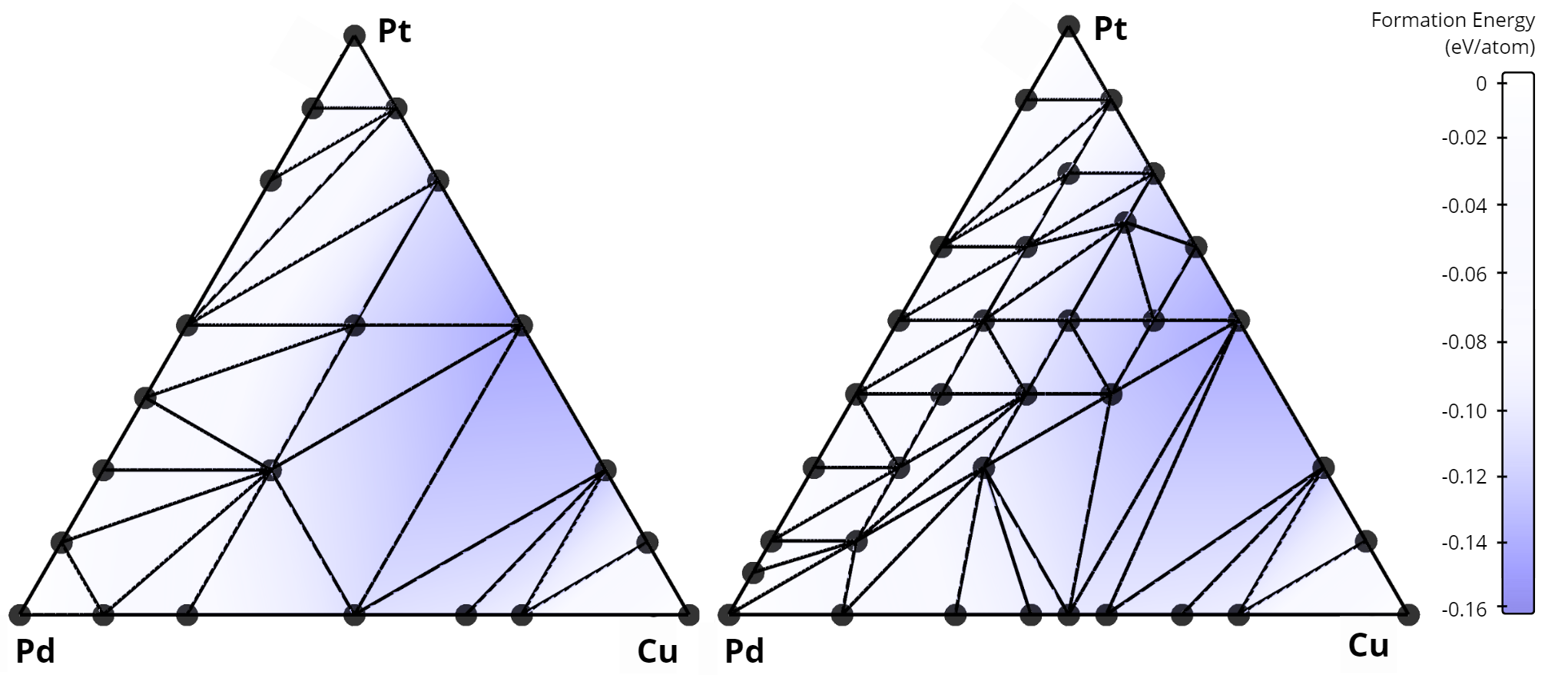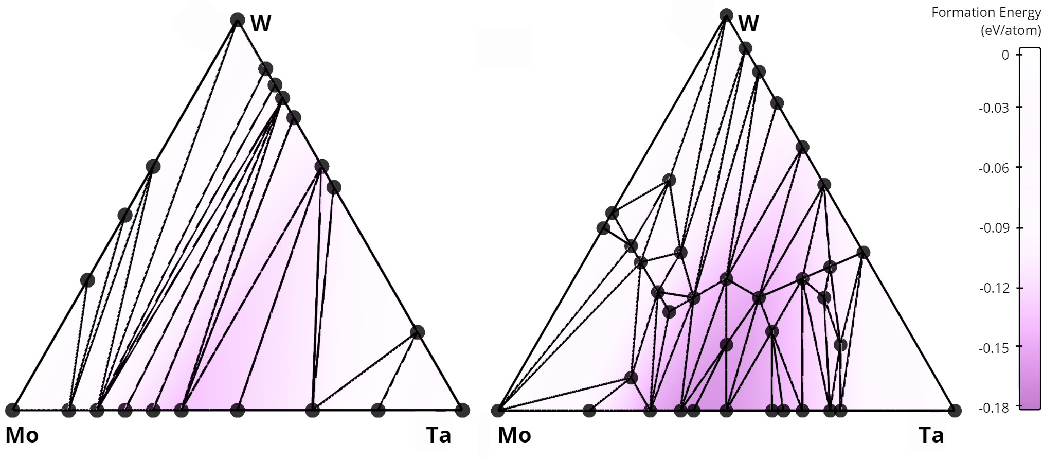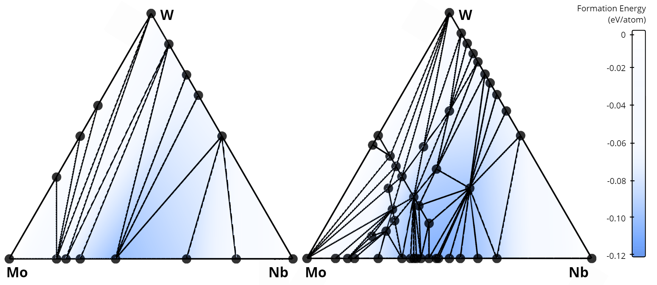 In total, our algorithm identified 268 new alloys that were not previously listed in the AFLOW database. A comparison of the stability diagrams for alloys discovered in this work versus those from the AFLOW database is presented below. For example, in the Nb-Mo-W system, no ternary alloys exist in the AFLOW database (left figure), while our method uncovered 15 new ternary compounds (right figure).