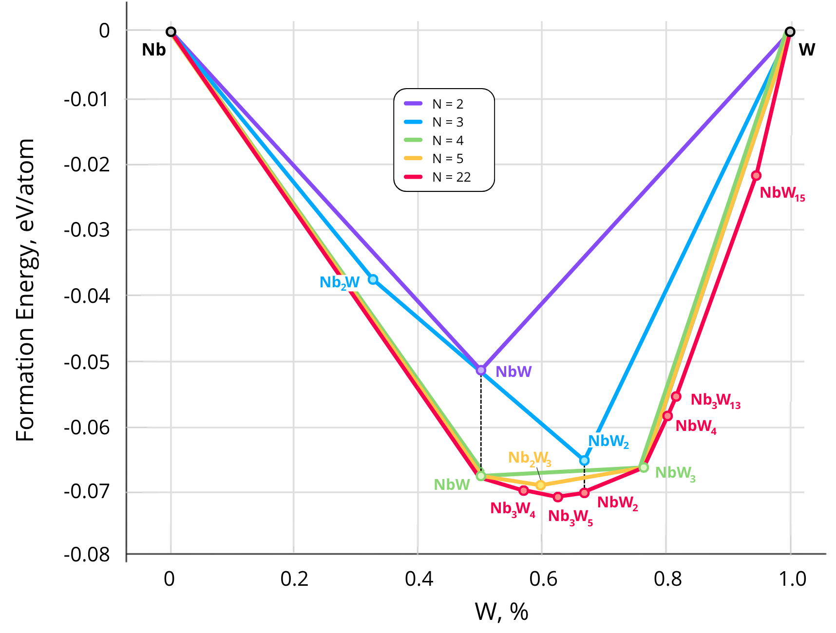 As part of the alloy discovery process, our algorithm constructs the convex hull—a stability diagram of alloys. This diagram represents the relationship between the formation enthalpy per atom (, eV/atom) and the composition of the alloy (e.g., the fraction of tungsten in the binary system ). As the number of atoms in the supercell increases, the algorithm considers a growing pool of structures, including increasingly stable candidates, causing the convex hull to deepen, as illustrated in the figure below: