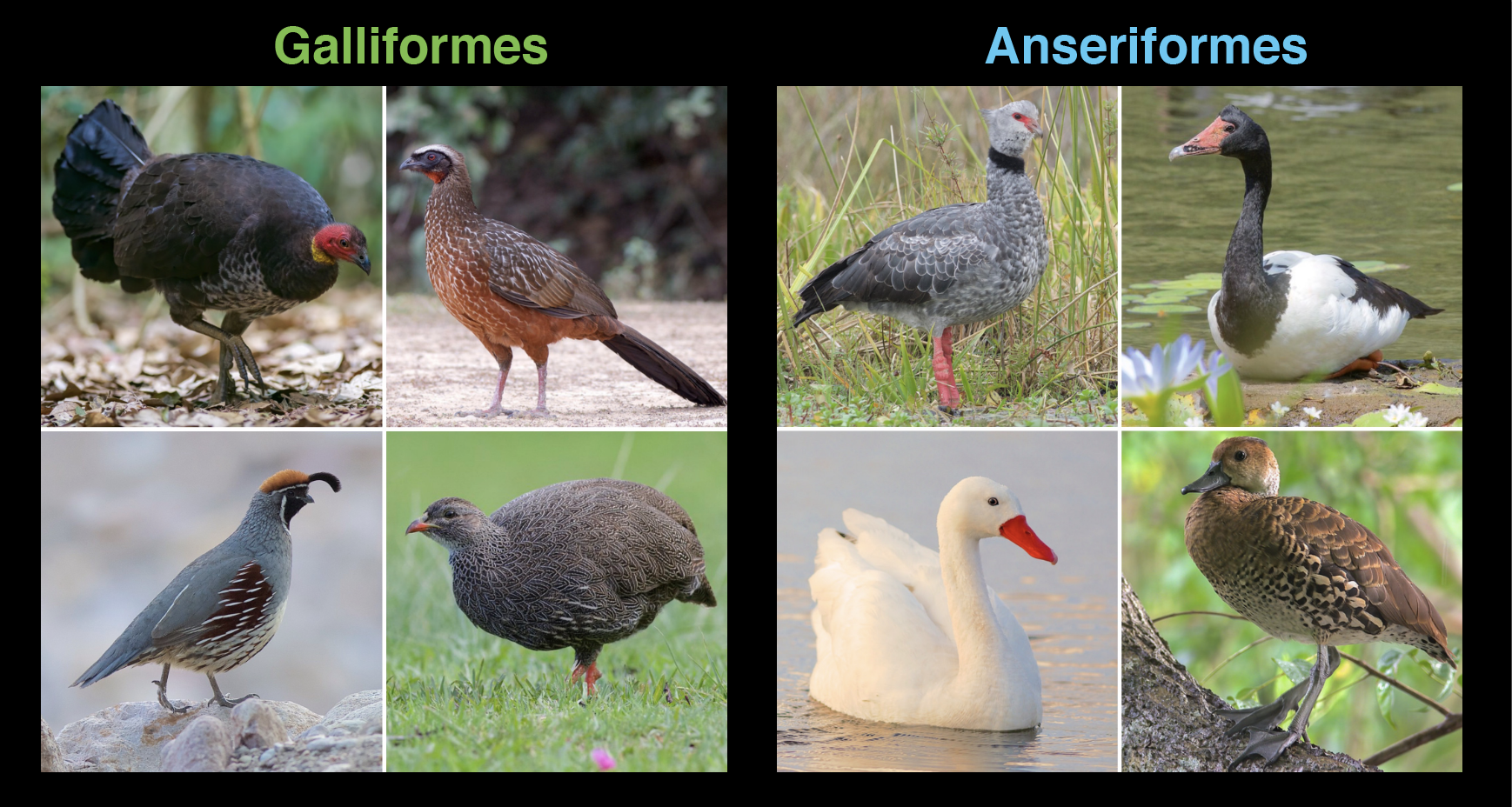 The major groups of living Galliformes (left) and Anseriformes (right). Clockwise from upper left for Galliformes: moundbuilders, guans and curassows, pheasants and kin, New World quail. Clockwise from upper left for Anseriformes: Screamers, Magpie Goose, Whistling Ducks, all other ducks + geese + swans. © Daniel J. Field.