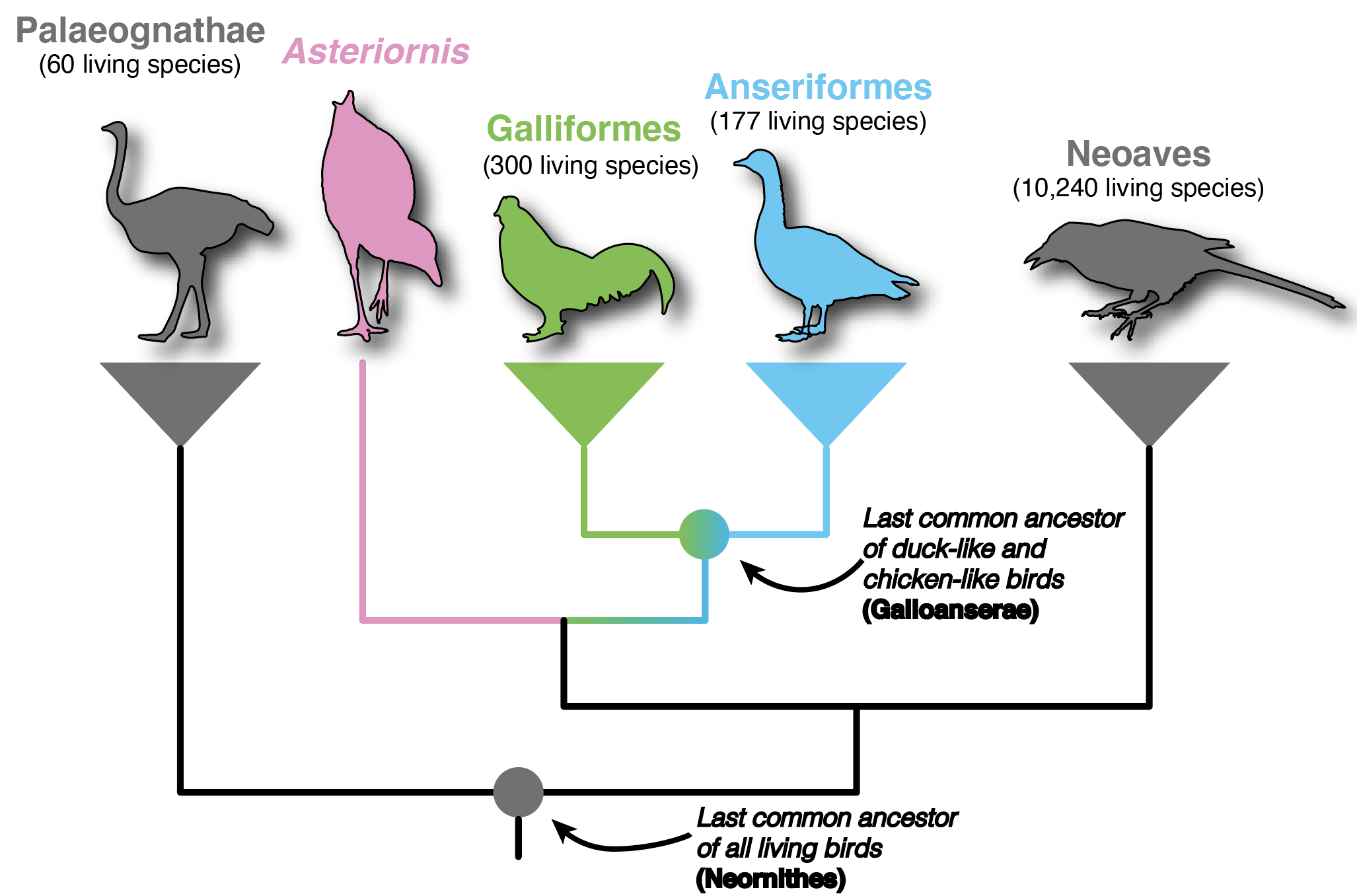 Most parsimonious phylogenetic position of Asteriornis, near the last common ancestor of Galliformes and Anseriformes. © Daniel J. Field.