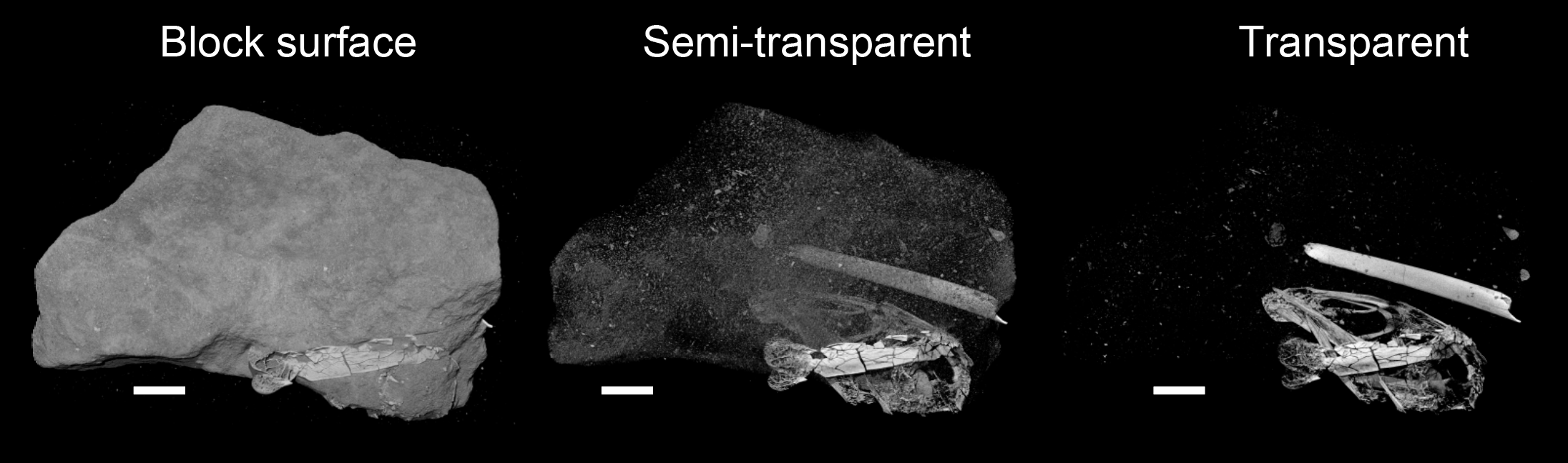 The main fossil block with the low-density rock progressively removed to reveal the Wonderchicken skull inside. Scale bar is 1 cm. This is taken from Extended Data Fig. 7 from our paper. © Daniel J. Field.