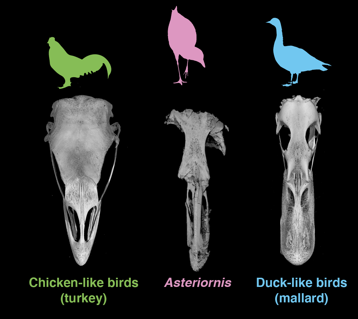 Comparison of the skulls of living Galliformes (left) and Anseriformes (right) with the Wonderchicken (Asteriornis, centre). The front of the fossil skull shows important similarities to galliforms while the back of the skull is more similar to anseriforms. Images not to scale. © Daniel J. Field.