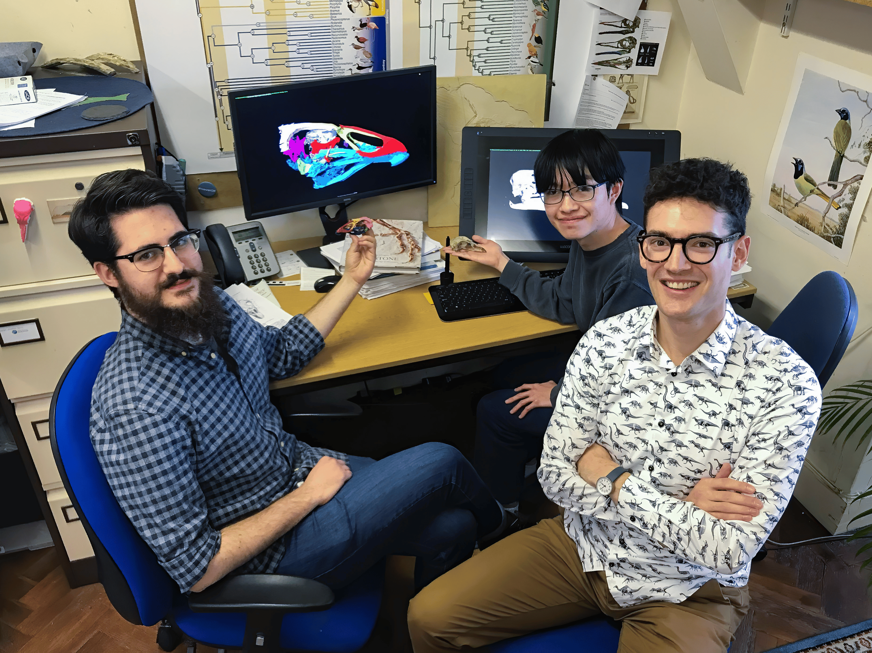 The Cambridge contingent of the research team. PhD students Juan Benito (left) and Albert Chen (back), and PI Dr Daniel Field. Photo credit: Klara Widrig. Dr John Jagt (Natuurhistorisch Museum Maastricht) and Dr Daniel Ksepka (Bruce Museum) were the additional contributors to the paper.