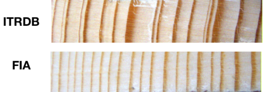 Figure 3: Two radial growth patterns of a typical “targeted” ITRDB sample (top) and an inventory FIA sample (bottom). The ITRDB sample shows much higher year-to-year variability in ring widths compared to the more stable, “train track” growth pattern in the FIA sample.
