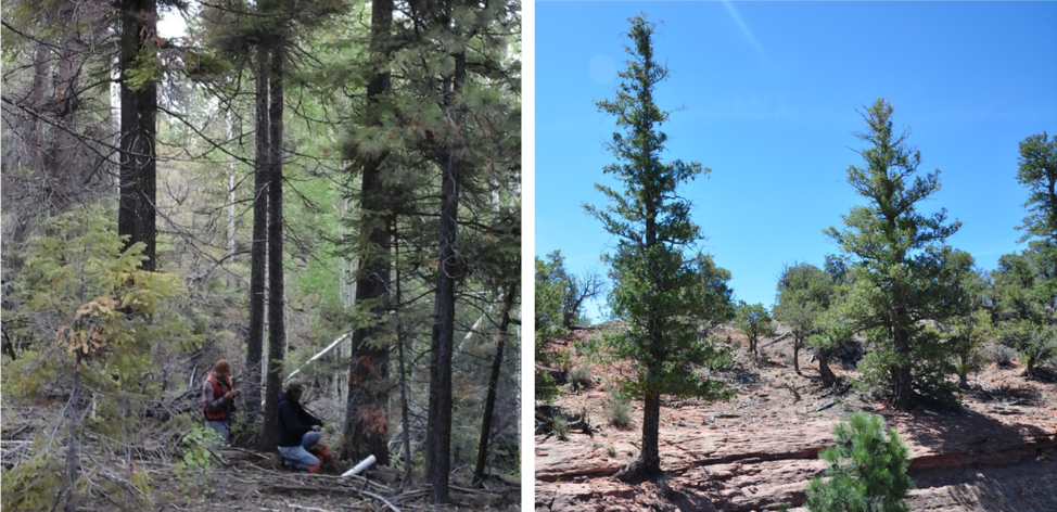 Figure 2: Contrasting site and tree conditions. At left is an upper elevation (2743 meters), Douglas-fir dominated forest inventory plot, with fertile growing conditions and high tree density. At right is another Douglas-fir dominated site, but this one at lower elevation (2286 meters), targeted for its older trees and nearly non-existent soils. Site conditions such as those at right limit moisture available for tree growth and result in higher ring width variability and a stronger response to climate variation. The two forests are just 27 km apart. The site in the right-hand photo would be considered a good sampling site for answering questions about historic climate variation, and thus may be typical of ITRDB sampling sites. In contrast, the site in the left-hand photo would not be considered a desirable sampling site for research questions aimed at better understanding the climate system. Photos by C. Guiterman.