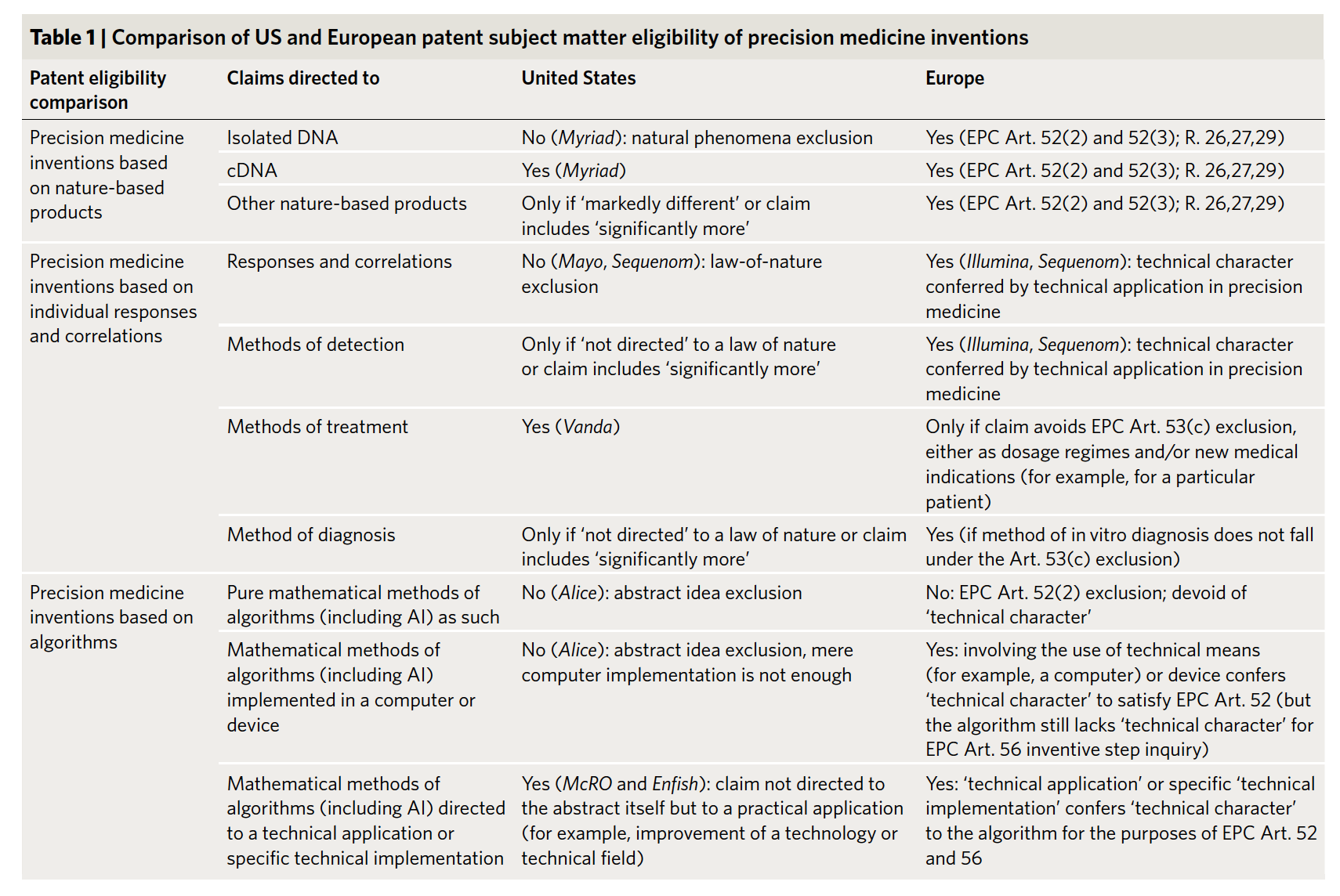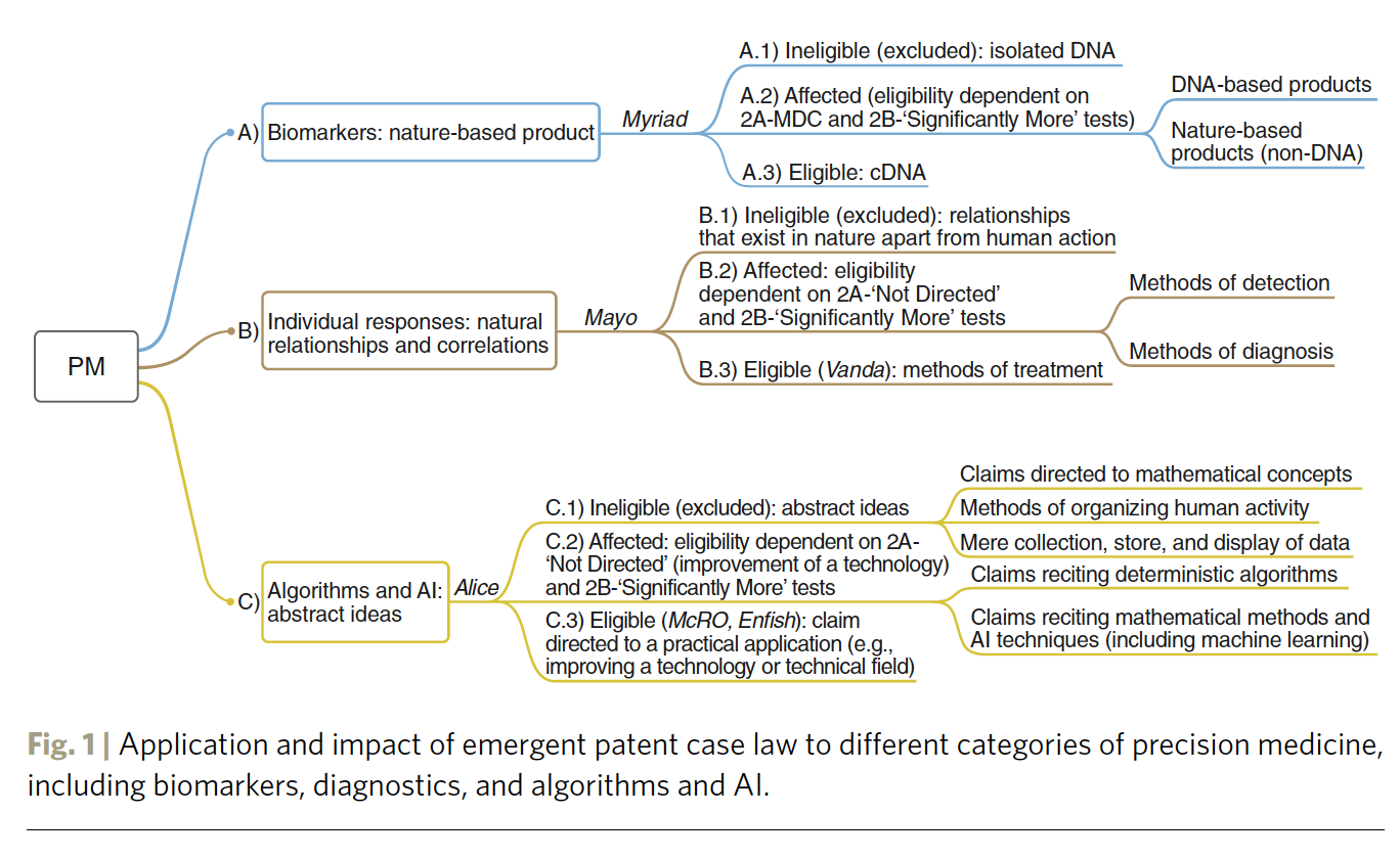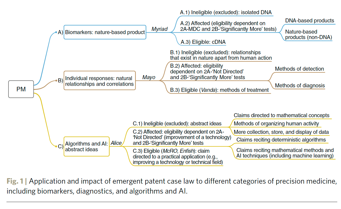 Precision medicine has stirred the excitement of patients, physicians, industry, entrepreneurs, and investors — it is already a market that is worth tens of billions of dollars with very rapid growth expected. But the future of precision medicine heavily depends on the intellectual property frameworks that apply to its various forms. In order to chart this future, in this Nature Biotechnology paper we compare recent patent case law in the US and Europe in three areas of precision medicine: (1) biomarkers and nature-based products; (2) diagnostics; and (3) algorithms, big data, and AI. Our overarching goal is to explain how today’s law will affect tomorrow’s innovation.
