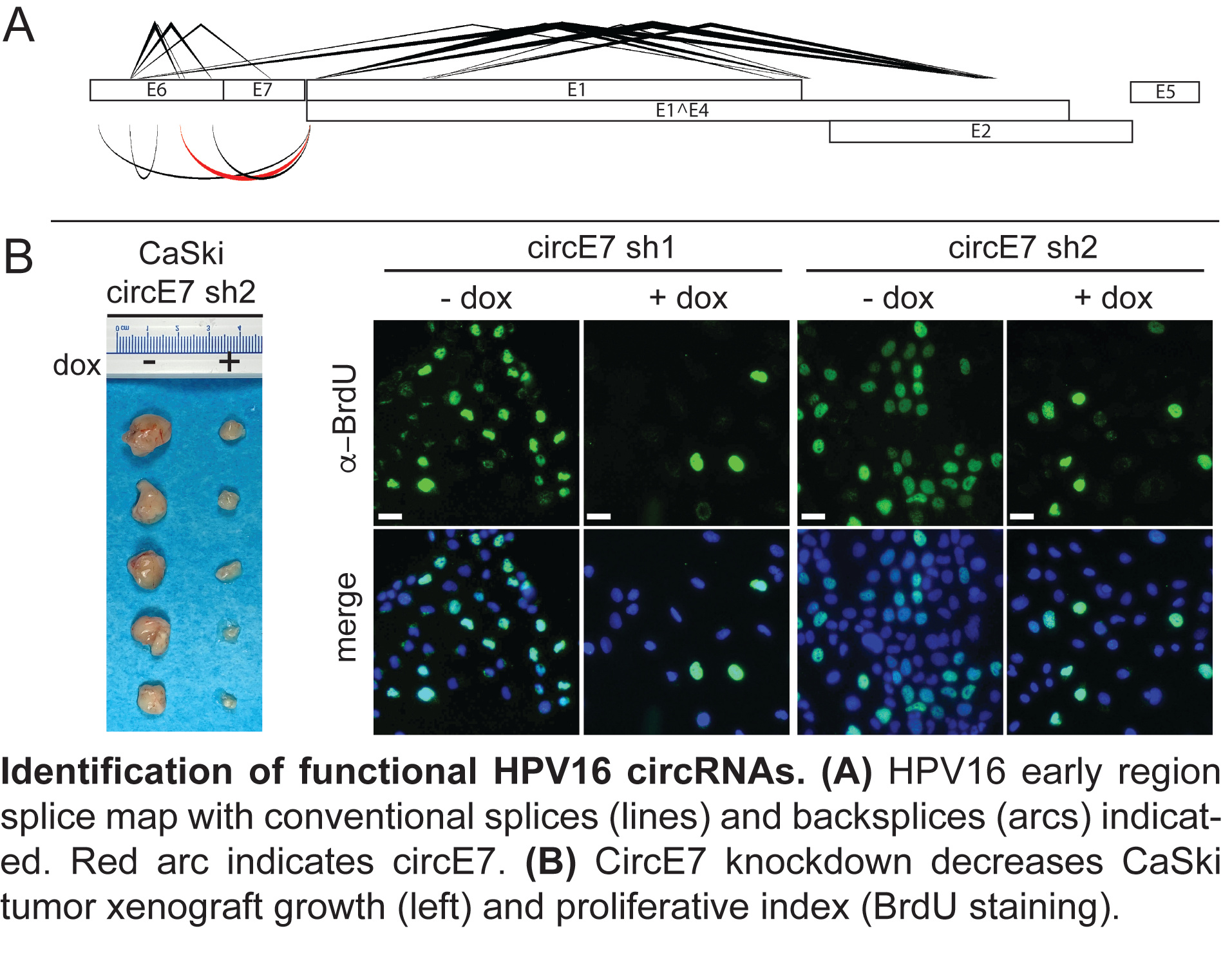 Our study began with a simple question: Do human papillomaviruses (HPVs) generate circular RNAs? The small size of the HPV genome coupled with the availability of Sequence Read Archive (SRA) data from HPV positive cervical cancer tumors made it straightforward to address this questions. Specifically, we used BLAST to query whether any unexpected “backsplice” junctions were present in SRA datasets. Based on the detection of several potential backsplices surrounding the E7 oncogene HPV16, we sought the help of bioinformatics colleagues to analyze all available SRA datasets more systematically. Jiwoong Kim generated a custom algorithm that identifies and maps circRNAs from viral genomes. These more systematic analyses confirmed that a circRNA encompassing the E7 oncogene, circE7, was the most abundant. CircE7 could be detected both by Northern blot and inverse PCR in a number of HPV16 positive cancer cell lines. We further collaborated with Cheng-Ming Chiang at UT Southwestern and Lou Laimins at Northwestern to identify cell lines with only episomal HPV. The presence of circRNAs in cells with non-integrated HPV confirmed that circRNAs were not artifacts of aberrant HPV integration events and could be regulated by differentiation. Proving that circRNAs are not only present but also functional has eluded all but a few circRNA to date. Thus, the more important question was whether circE7 had any important, non-redundant functions. Because circE7 was present at low levels compared to other E7 sequence containing RNA in HPV16 transformed cell lines, it was unclear whether circE7 would make a significant contribution to HPV biology. Thus, it was surprising and exciting to see that CaSki cervical carcinoma cell growth in vitro and in tumor xenografts was markedly inhibited by shRNA-mediated knockdown of circE7.
