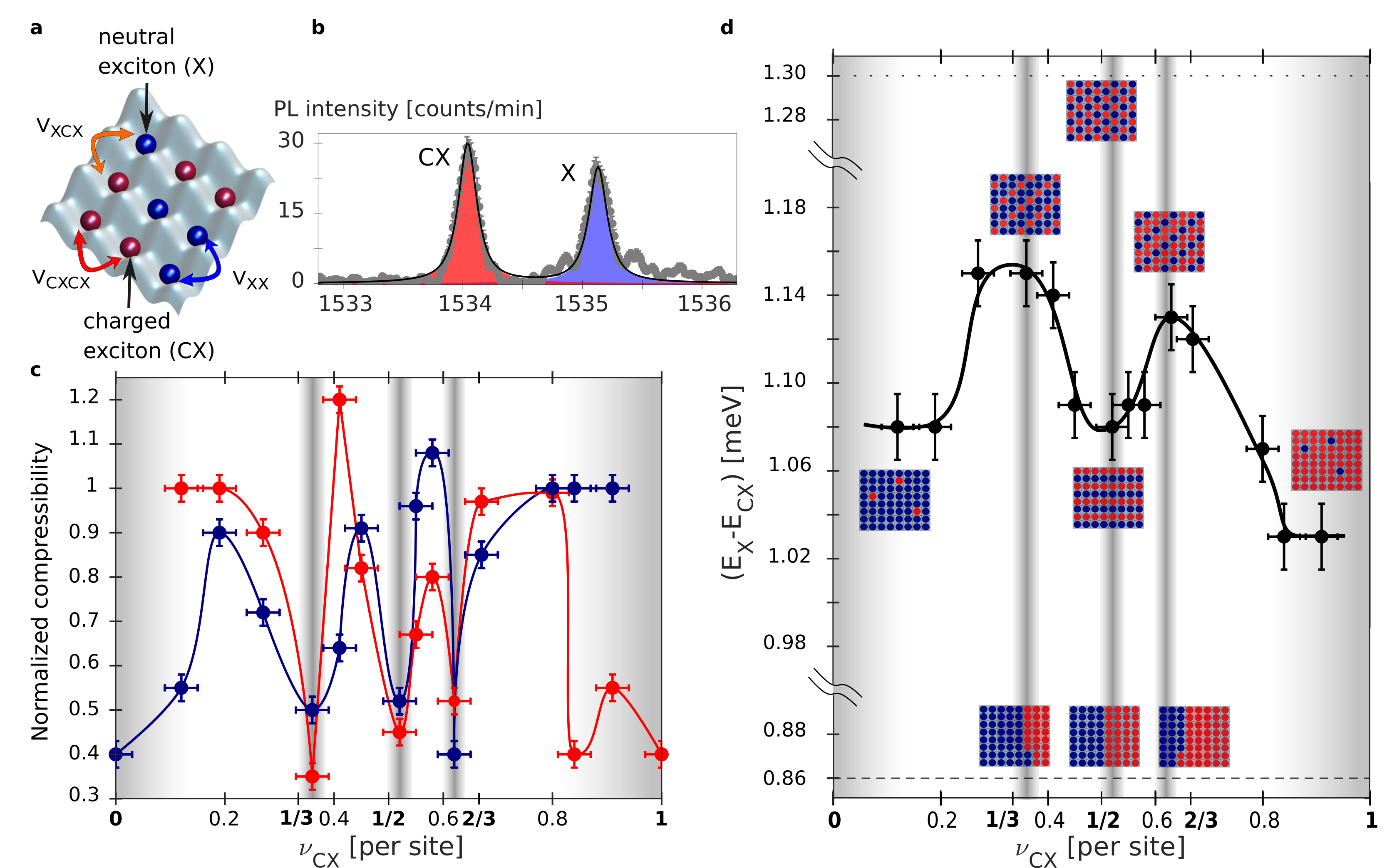 Figure 3: a Neutral (X, blue balls) and charges (CX, red balls) excitons confined in the 2D square lattice experiencing intra and inter species NN interactions. b Spectrum showing two PL peaks separated by around 1 meV attributed to CX (red) and X (blue). c Compressibility of X (blue points) and CX (red points) for a total unitary site filling as a function of the CX filling. d Energy difference between the X and the CX PL peaks as a function of the CX filling. The expected phases are drawn close to there corresponding energy differences. The shaded area mark the presence of insulating phases in c and d. This figure is adapted from Ref. (12).