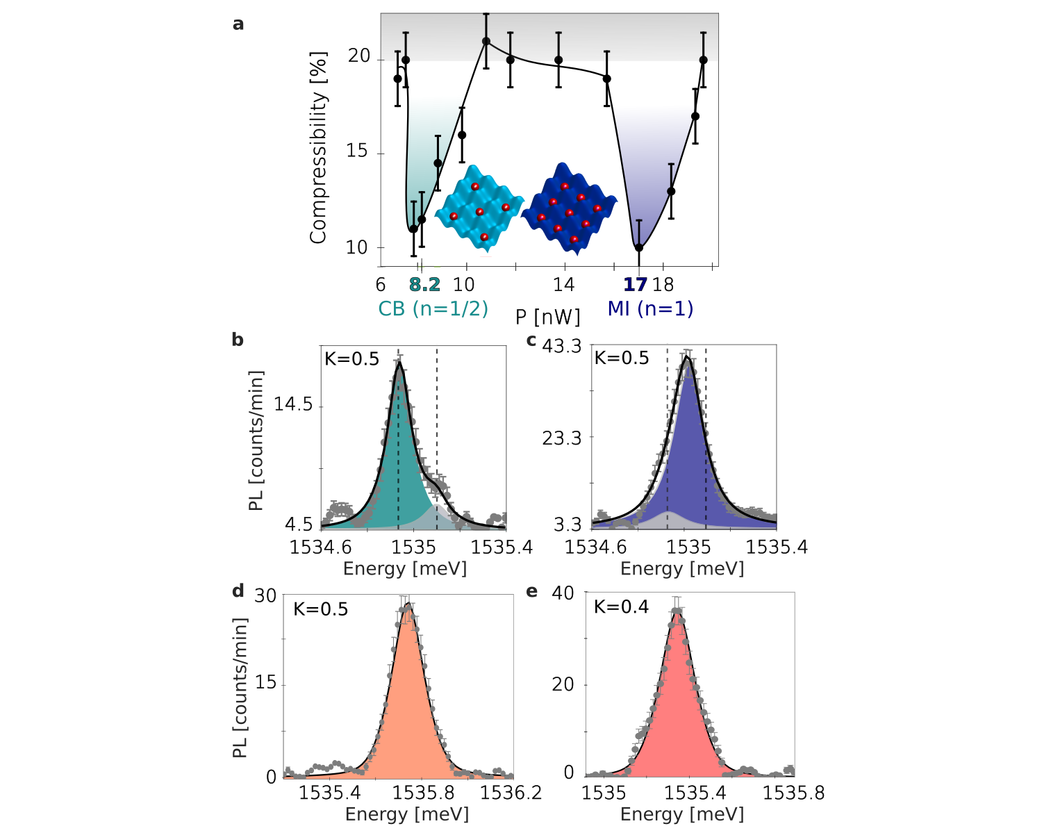 Figure 2: a Compressibility of excitons confined in a 250 nm period square lattice as a function of the laser excitation power that controls the excitons density. The Compressibility shows two minima signalling MI and CB phases at unitary and half filling of the lattice sites. The X spectra in MI and CB phases are shown in c and b respectively. K is the compressibility normalized by the poissoninan compressibility. The spectra in e and d are the corresponding MI and CB for charged excitons confined in the 250 nm lattice. a, b ,c are adapted from Ref. (11). d and e are adapted from Ref. (12).