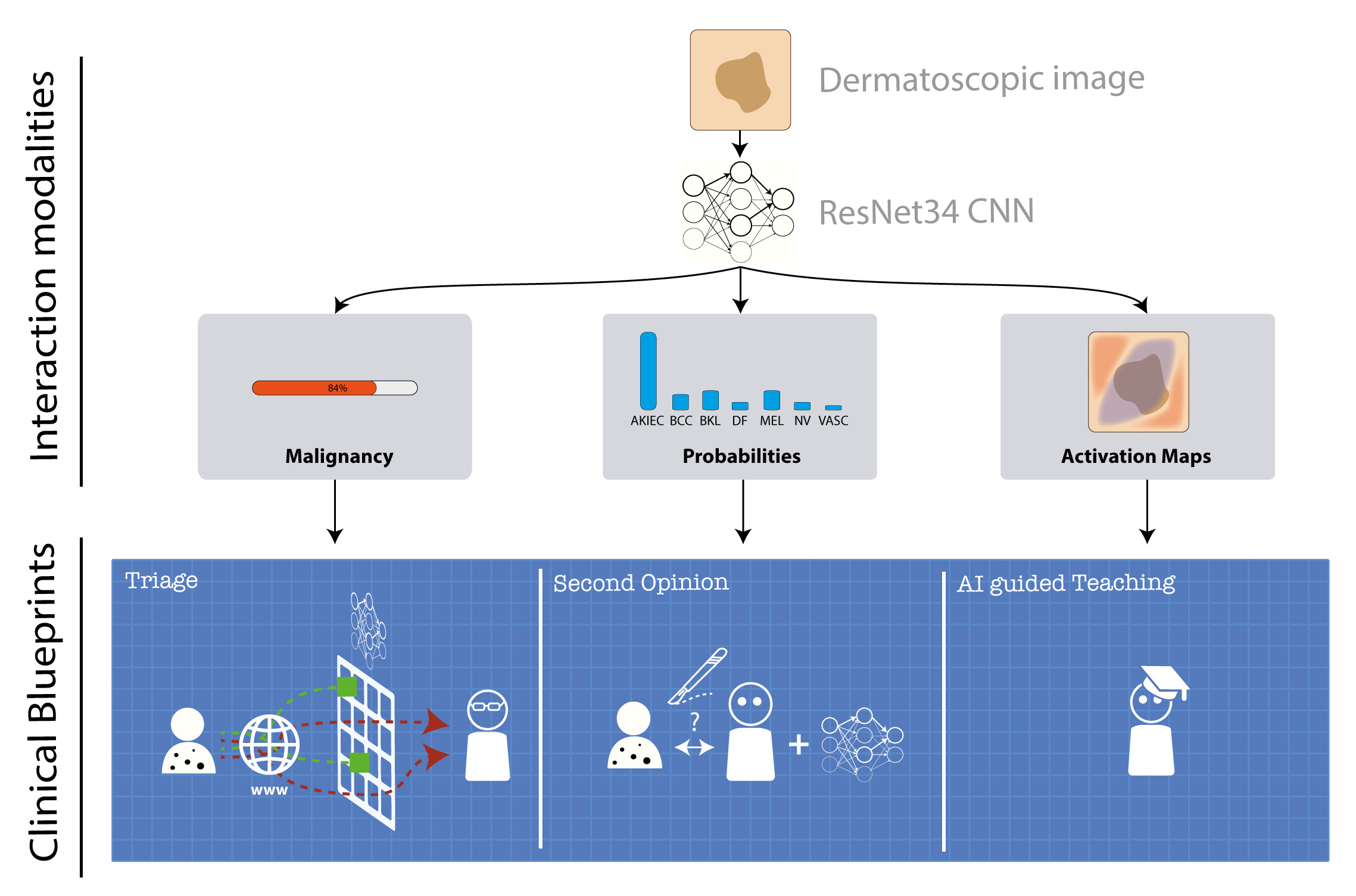 Media and pop culture love stories about the future rise of artificial intelligence and the potential of rogue machines. Dystopic Hollywood movies like the Terminator series picture the grim future of a desperate fight between a nearly extinct human race and a world-spanning synthetic intelligence. Even in mainstream science the current narrative is focused on a competition between human and artificial intelligence. Some researchers believe that AI will make human intelligence dispensable. Geoffrey Hinton, a distinguished person in the field of AI, suggested in 2016 that we should stop teaching radiologists now. What he meant of course is that AI will do the radiologists’ good work in the future. While this scenario is not nearly as threatening as the extinction of the human race (radiologists may disagree), it still challenges our professional pride. Other prominent researchers, however, do not share this point of view and it is still a matter of debate how exactly AI will influence medicine in the future (1). We took interest in this area of conflict and sought to shift the direction of this narrative more towards human/AI collaboration, at least in the field of diagnostic medicine. To this end we studied the use-case of skin cancer diagnosis. The initial idea was to explore the effects of varied representations of AI support across different levels of clinical expertise. With the help of the valuable suggestions and constructive critique from the reviewers and the editor of Nature Medicine we expanded this idea and ended up in exploring multiple clinical workflows and different scenarios including “rogue” AI.