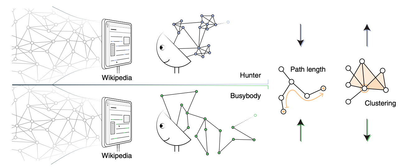 But how can a scientist measure or model this intuition of differences between diversity versus depth in information stores? For this, we turned to network science. Our choice of network science, which focuses on the strength of interconnections between units, was a natural fit to the notion that some networks (i.e., those of the hunter) would contain concepts more strongly related to one another than other networks (i.e., those of the busybody). Another motivation for turning to network science was the availability of the mathematical language of graph theory that could readily capture general notions of tight versus loose networks of informational resources.