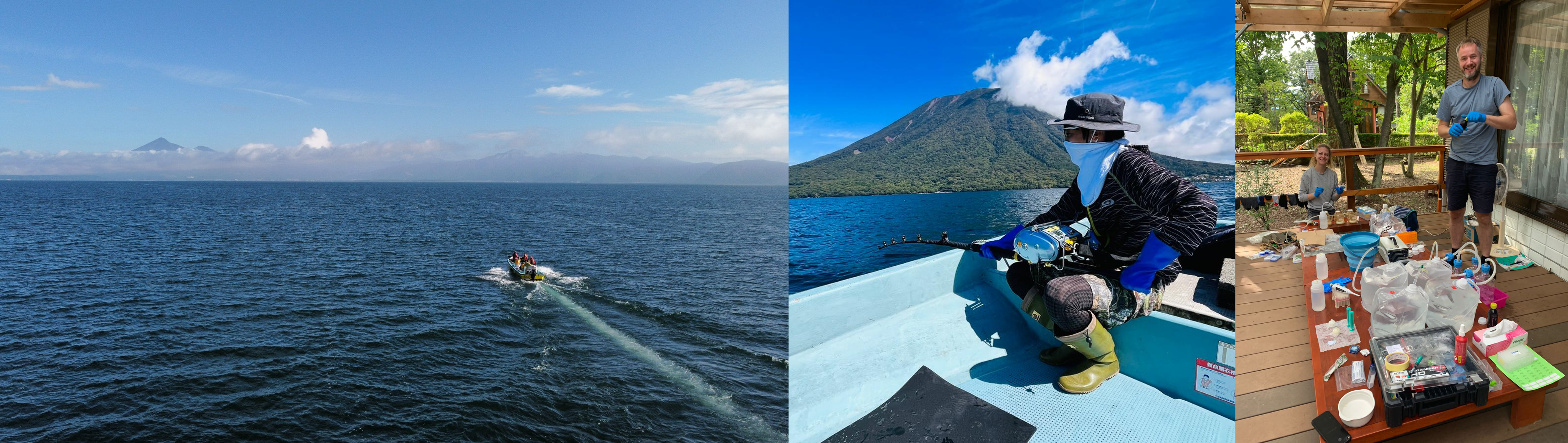 In autumn 2022, we traveled to Japan to sample four deep lakes with our collaborators Yusuke Okazaki and Shin-ichi Nakano from Kyoto University. Everything was meticulously organized by Yusuke, all permits were taken care of, and even a typhoon passing Kyoto caused only a few days delay. A research vessel was organized for Lake Biwa, and afterwards our sampling equipment was shipped ahead while we (Markus Haber, Cecilia Chiriac – both accompanied by their partners – Yusuke, his colleague Shin Sho and I) took the bullet train from Kyoto to the Fukushima region to Lakes Inawashiro and Chuzenji and then further north to Lake Toya on Hokkaido Island. For deep lake sampling, Yusuke used his custom deep-water sampler (essentially a tuna fishing rod with a 5-l Niskin bottle) to “fish for microbes”. Besides sampling and admiring the beautiful landscapes, we visited many cultural sites in Kyoto, Osaka and Tokyo and Yusuke and Shin introduced us to the fantastic Japanese cuisine with Sushi, Sashimi, Ramen, Okonomiyaki, Takoyaki, Tempura, Tonkatsu, Wagyu steaks and many more delicacies.