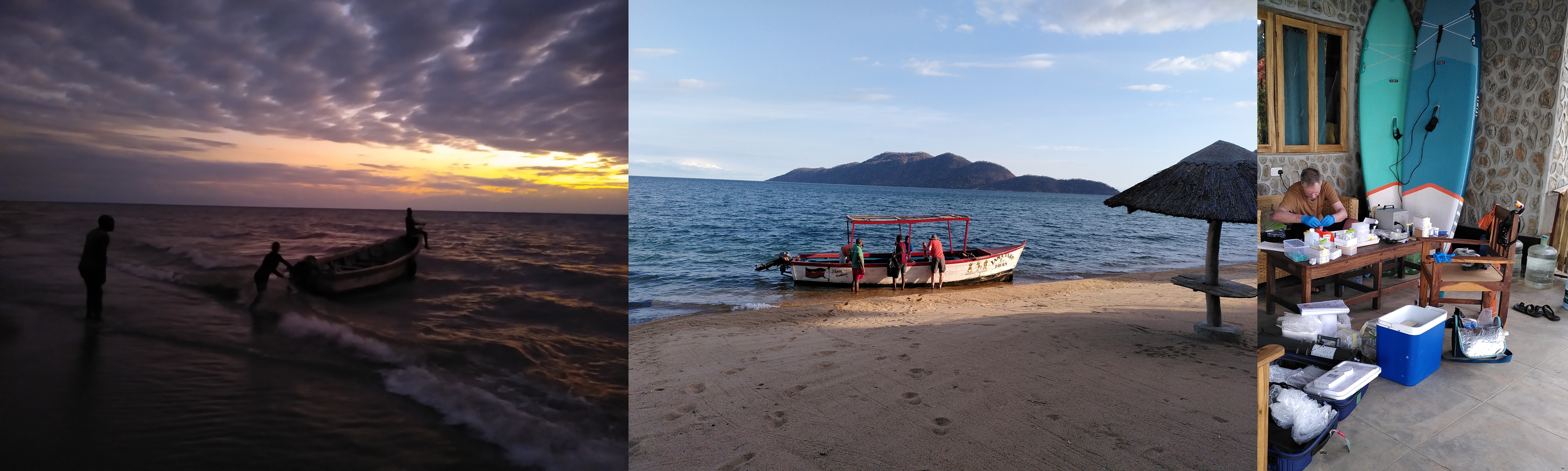 Lake Malawi was originally scheduled for 2022 but postponed because I severely underestimated the time-consuming paperwork for all the permits (Nagoya Protocol) and public health concerns. Although COVID19 was no longer a threat in Europe, it was still an ongoing pandemic in Africa as vaccines were not supplied equally on the globe and, moreover, Malawi faced a Cholera outbreak after being hit by a tropical Cyclone in 2022. By autumn 2023, we had all permits and the conditions were safe. We (Markus Haber, Tanja Shabarova and I) headed to Malawi, where Maxon Ngochera and his PhD student Paul from the Department of Fisheries in Lilongwe joined us to four sites along a north-south transect. Maxon organized boats from local fishermen and a winch with 200 m rope. Lake Malawi was challenging to sample because of its immense size (580 km length, 700 m depth) and stormy weather with high waves forced us to repeatedly modify our schedule. Besides rough conditions causing sea sickness for some of us, we also faced other troubles, sometimes our YSI probe failed, sometimes the winch, but Malawian fishermen were very helpful and well trained, they easily hauled the 10-l Niskin bottle by hand from 200 m depth. The lake and surrounding landscape were breathtaking, and we also spent a considerable amount of time snorkeling and diving with the endemic cichlids and adoring the local fauna and flora (it’s a bird watching paradise), we enjoyed fresh local fruits and freshly caught fish with Nsima, and met the most friendly people. Unfortunately, we brought back more than great samples and souvenirs: Two of us were later diagnosed with schistosomiasis (parasitic flatworms), and I was also tested positive for strongyloidiasis; it seems that we spent just too much time in the warm and clear waters of Lake Malawi. Thankfully, we recovered swiftly after medical treatment.