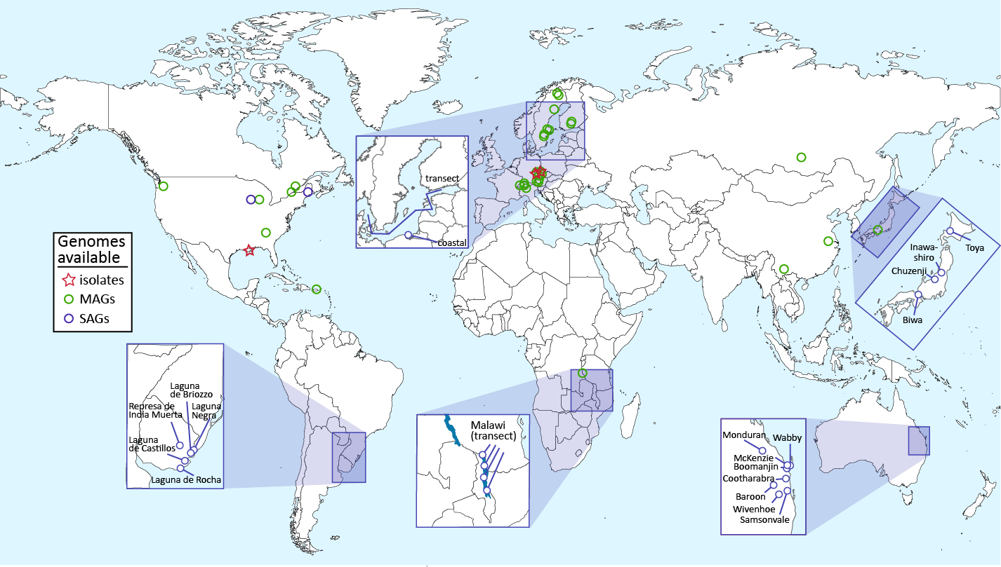 Just a quick wrap-up: We isolated seven new strains, tested hypotheses derived from genomic analyses in growth assays, and conducted global and seasonal metagenomic analyses including unpublished time series datasets (LIMNOS) kindly provided by our collaborator Hans-Peter Grossart. Our global sampling focused mainly on the underrepresented Southern Hemisphere and yielded many high-quality MAGs (metagenome-assembled genomes), allowing detailed phylogenomic analyses, the description of several new species, and the discovery of endemic species in the African Great Lakes and species confined to the Northern or Southern Hemisphere.