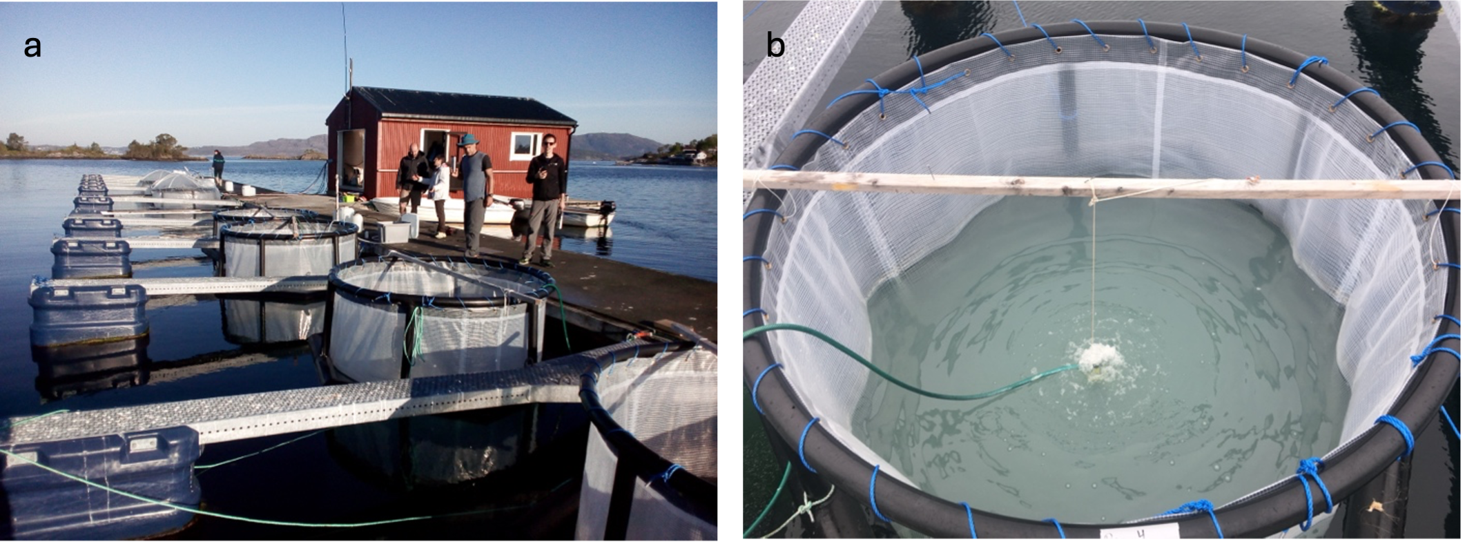 a, The experiment included seven bags submerged in the fjord and filled with fjord water to capture natural plankton communities. b, An algal bloom was induced by adding nutrients to the water in the bags. The milky shade of the water in the bag indicates the high concentration of the algae Emiliania huxleyi.