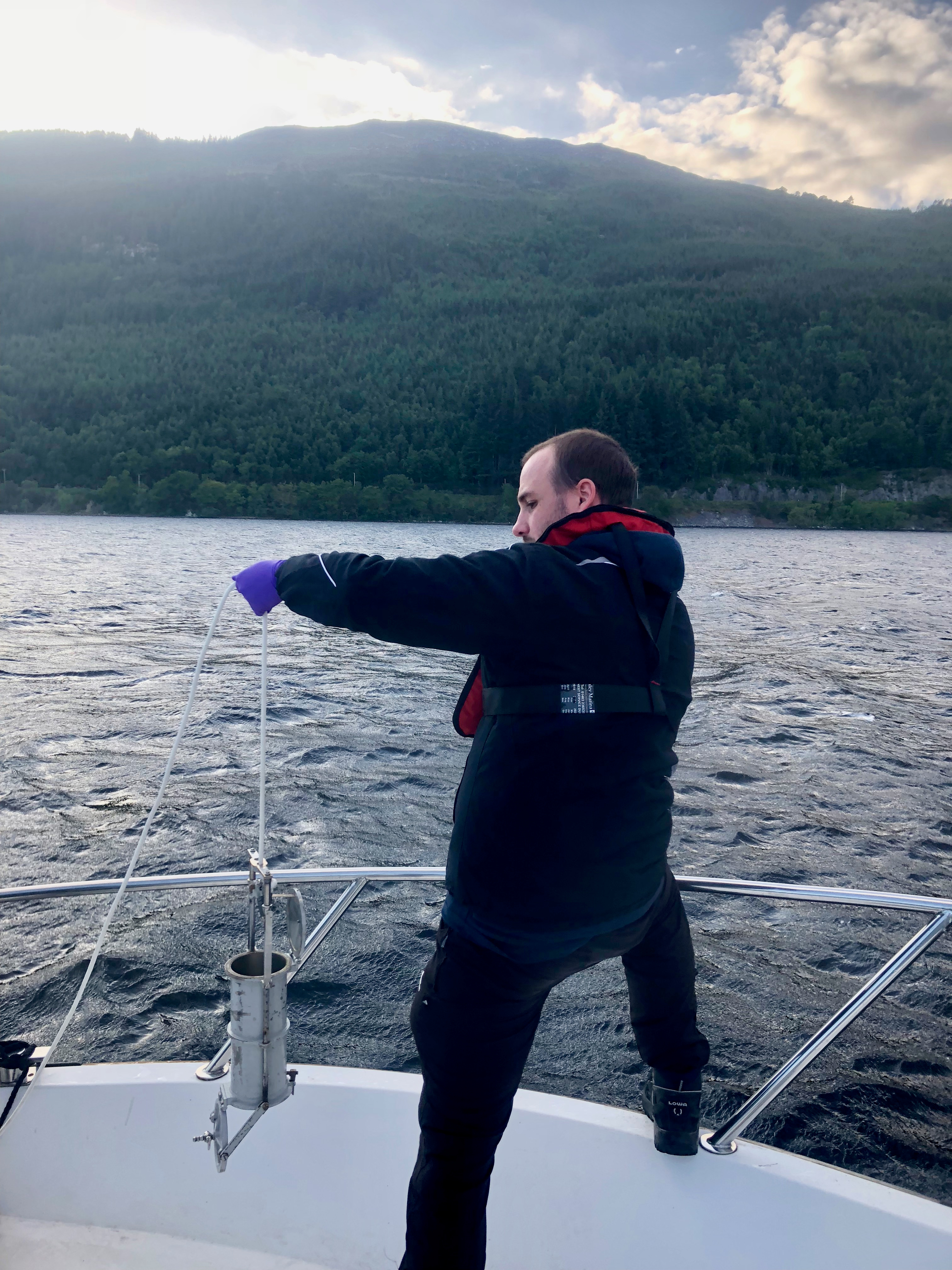 Miraculously, for the Highlands, the wind stayed light and the rain stayed away which meant we were able to send teams out to sample right around Loch Ness by car and small boat, as well as several nearby lochs as controls. In the evenings we used the Loch Ness Centre boat to sample up and down Loch Ness, particularly targeting the deep water, down to 200 metres.