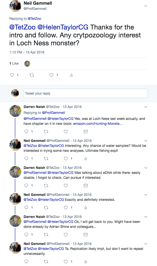 About two years ago Darren Naish had just published a book Hunting Monsters, which included a summary of work on Loch Ness. Over a tweet or two I asked him if, in his research for the book, he had stumbled on anyone that was using eDNA to search for evidence of Nessie. The answer was no, but we both thought it a splendid idea.