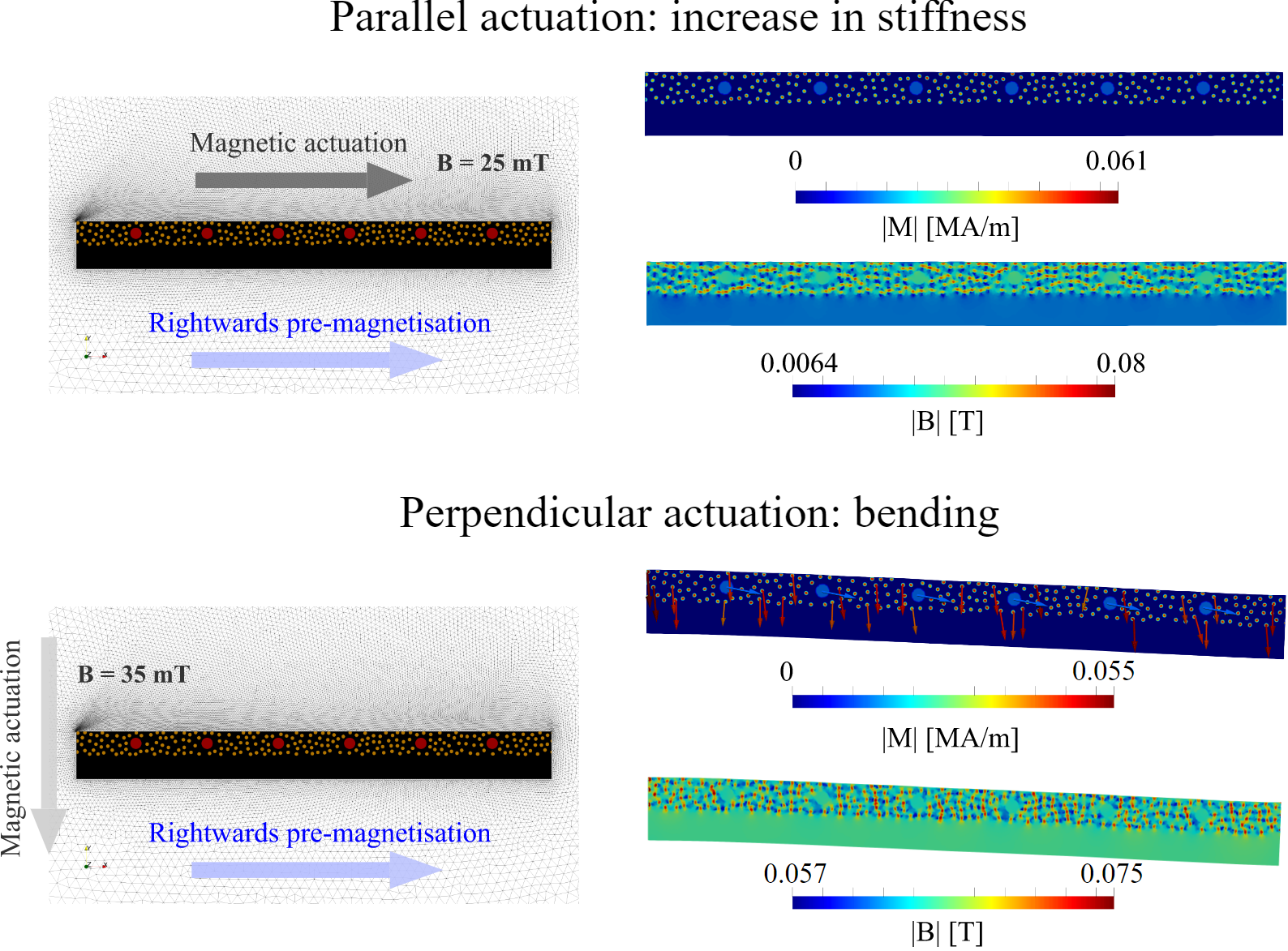 Figure 2: Bimorph beam conceptualised with a hybrid magnetorheological elastomer. When the beam is exposed to a parallel magnetic field, the structure presents an increase in effective stiffness. Moreover, when the beam is exposed to a perpendicular magnetic field, the structure experiences bending. The figure shows the magnetisation and magnetic flux density distributions within the beam. The microstructural magnetic bridges can be observed in both actuation modes.