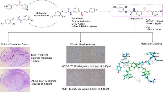 Several compounds demonstrated low micromolar antiproliferative activity, particularly against MCF-7 cells. Among these, compound 6f showed the most consistent biological activity, including potent growth inhibition in both MCF-7 and A549 cells, strong enzymatic inhibition of c-Met, and significant suppression of colony formation and cell migration.