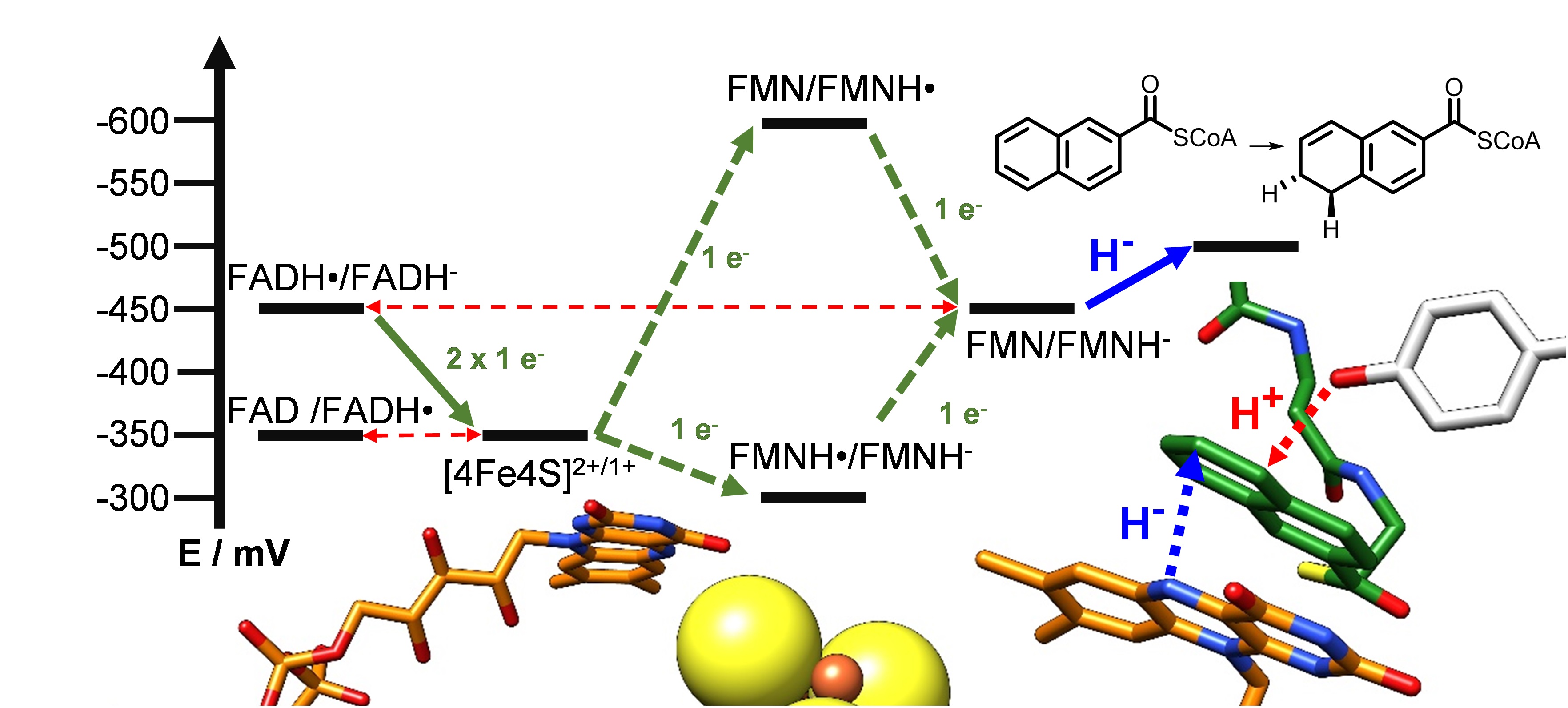 In this paper we present evidence that the mechanism of NCR involves an extremely negative hydride transfer that proceeds at almost -500 mV. This finding is very astonishing, as single-electron/proton transfer (analogous to the Birch reduction) is the usual mechanism for biological reductions in this redox potential range. Even more striking is that the architecture of NCR is similar to a well known class of so called “old yellow enzyme” (OYE) ene-reductases, that were first isolated in the 1930s. This class of enzymes usually catalyzes the NADPH-dependent reduction of activated double bonds and members are already used in asymmetric reductions in synthetic routes. NCR is the first OYE-like enzyme that is capable of reducing activated aromatic double bonds. The protein backbone is modified to turn a simple OYE into a highly specific aromatic-ring reductase and the active site environment tunes the reduction potential of a common flavin mononucleotide (FMN) to the limit of biological hydride transfer processes. The electrochemical and spectrophotometrical analysis of NCR revealed the highly cooperative interplay of electron-transfer cofactors that enables unidirectional transfer of single electrons from a flavodoxin-like low-potential one-electron carrier (FAD) to an FMN for low-potential hydride transfer and prevents the reverse reaction. QM/MM calculations support our findings that NCR indeed catalyzes the most negative hydride transfer in biology known to date.