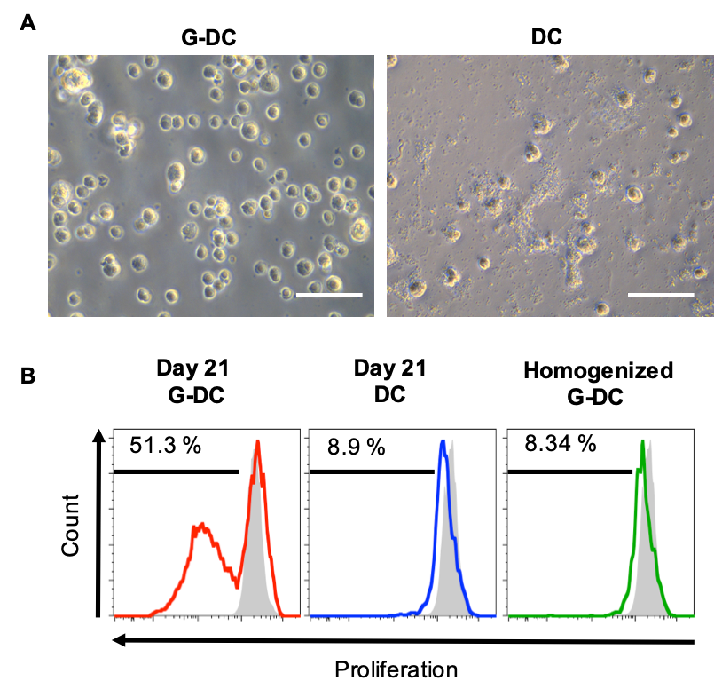 (A) Morphology of gelated dendritic cells and non-gelated dendritic cells following 21 days of storage at 4C. Scale bars = 50 um. (B) In vivo expansion of adoptively transferred OTI-specific CD8 T cells by gelated dendritic cells, non-gelated dendritic cells, and gelated dendritic cells following homogenization.