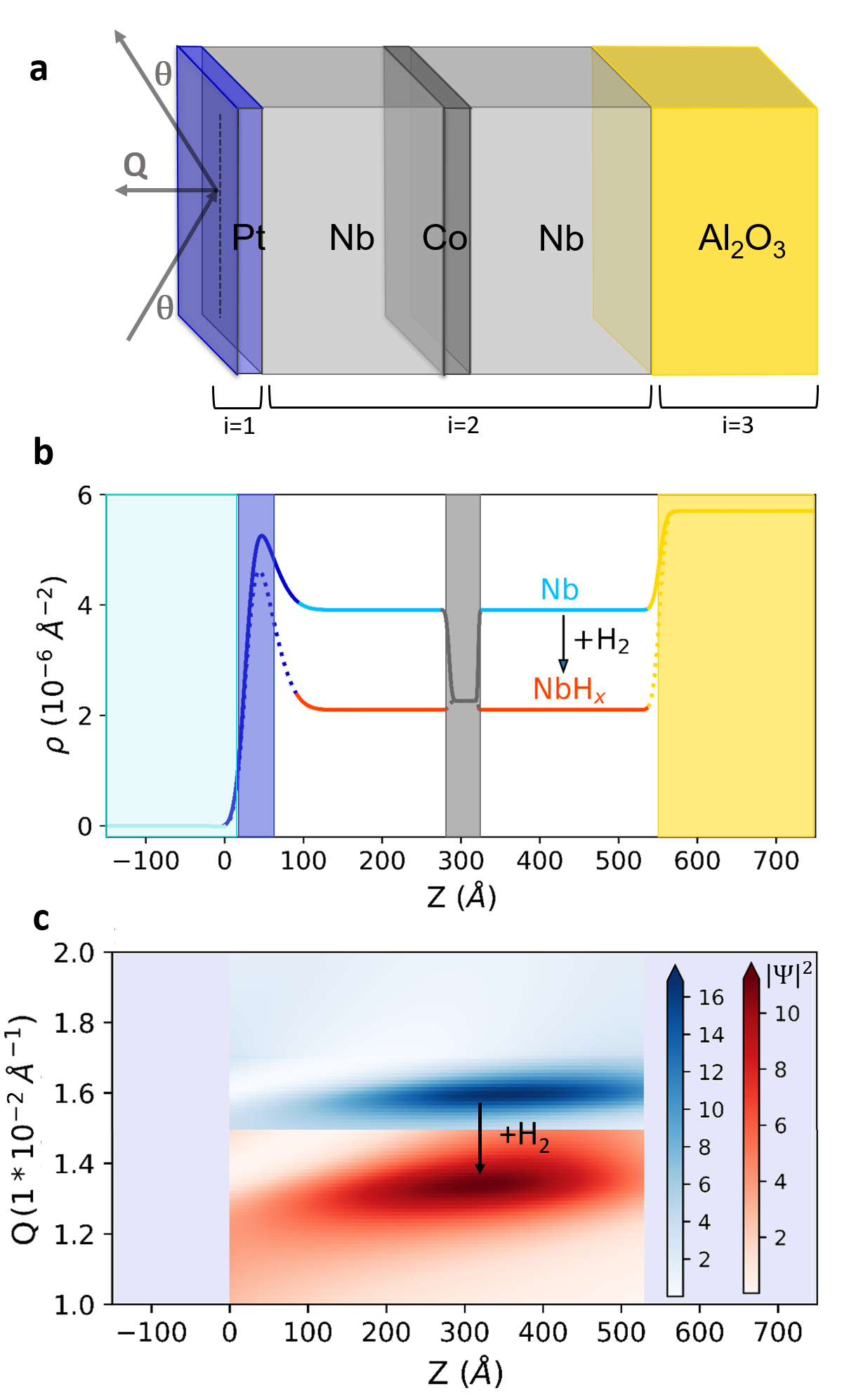For the method's proof of principle samples of composition Al2O3/Nb(25nm)/Co(3nm)/Nb(25nm)/Pt(3nm), sketched in Fig.1.a, were considered. The middle layer was chosen to be niobium, which is a well-known hydrogen absorber. The Co inserted in between Nb layers acts as the label magnetic layer needed to trace position of the resonance. The structure was capped by Pt(3nm) layer in order to enable the splitting of H2 molecules at the surface and diffuse H atoms to the underneath layers. The scattering potential of all layers versus sample depth forms a potential well, as shown in blue line in Fig.1b. Due to this well the neutron density is resonantly enhanced at the depth of the middle layer and momentum transfer Qres, as shown in the blue area of Fig.1c. The relation between the incoming angle of radiation and Q is shown in Fig.1a.
