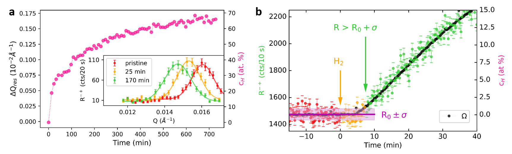 The resonant neutron reflectometry, or RNR, thus consist in tracking the resonance position Qres while H is absorbed in the sample. This was done in two different modes, one by making a series of consecutive short Q-scans around the resonance (inset of Fig.2a), which allowed to study the full kinetics of absorption with a time resolution of around 8 minutes, as shown in Fig.2a. The other mode consisted in staying at fixed Q and measure the variation in reflected intensity, which was in turn translated to hydrogen content cH as shown in colored dots in Fig.2b. This mode allowed to reach a time resolution of few seconds and a sensitivity of around 1 atomic % of hydrogen. In situ electrical transport measurement (black dots) showed a remarkable correlation with RNR, confirming the validity of RNR versus a well known hydrogen detection method.