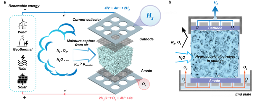 A scaled-up five DAE stacked prototype runs in an open environment with a high Faradaic efficiency of over 95%, with more than 99% hydrogen purity. Moreover, this DAE can work under a bone-dry environment with a relative humidity of as low as 4%, and can be easily scaled to provide H2 to remote, (semi-) arid, and scattered areas. To our knowledge, this is the first report of the production of pure hydrogen directly from the air.