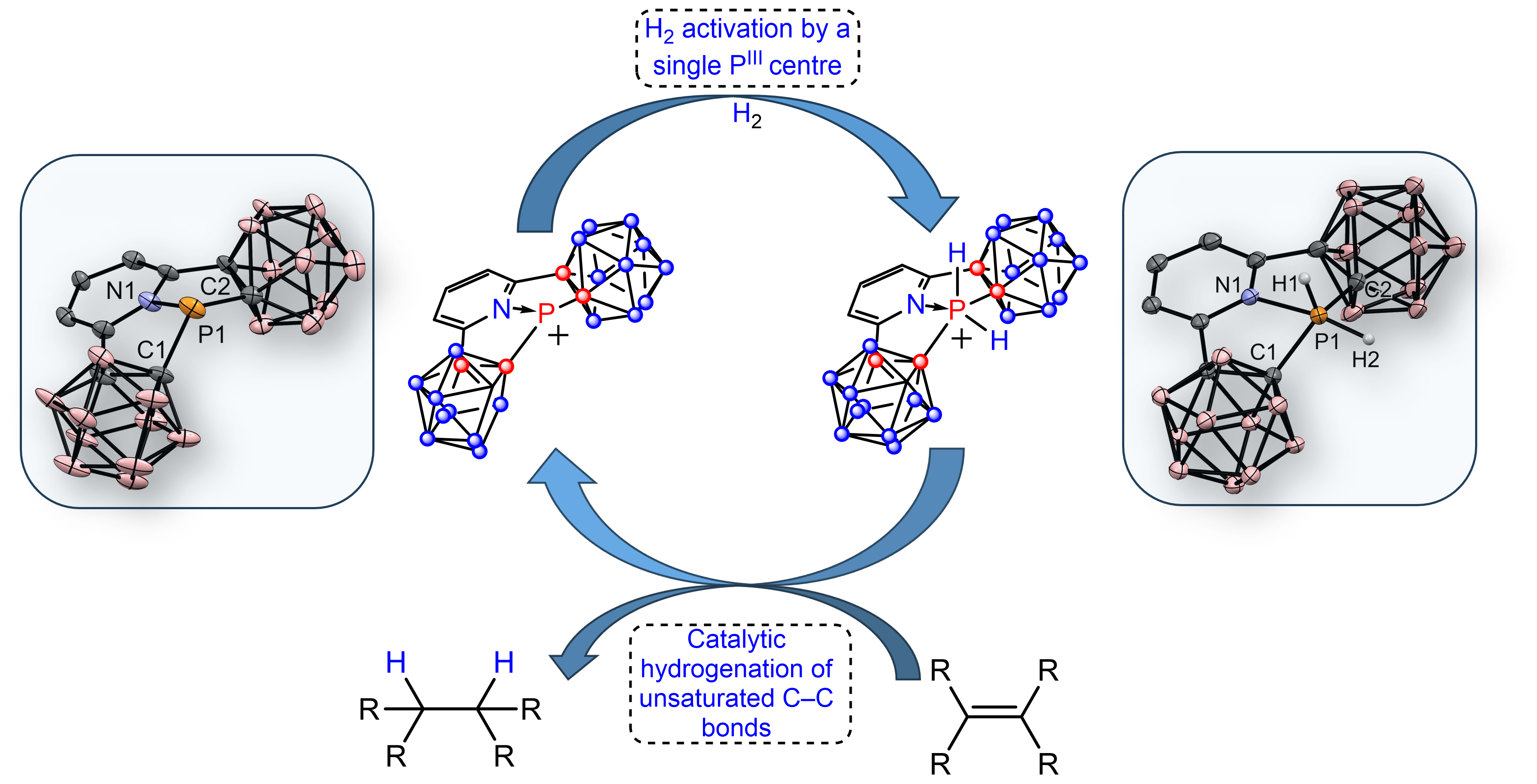 In this work, we decided to use a bis-carborano-pyridine pincer-type ligand to constrain a cationic PIII center. We envisioned that the rigidity of this ligand would efficiently constrain the PIII center, while the electron-withdrawing nature of the ortho-carboranes would further increase the reactivity of this PIII cation. Additionally, the central pyridinyl moiety would stabilize the P-center. After successfully synthesizing this cation, we pressurized it with H2 (~4 atm) and monitored the reaction by NMR over several days. To our great satisfaction, after just a few days, the product of the H-H bond oxidative addition to the P-center was observed. This activation could be sped up by mild heating of the reaction. Remarkably, this represents the first example of the oxidative addition of the H-H bond to a single P-center. Next, we investigated whether our new phosphenium cation could be used as a hydrogenation catalyst, and again we were pleased to find that this new cation can be used for the catalytic hydrogenation of the doubly bonded C=C and fused aromatic species. Although the scope of unsaturated species that could be hydrogenated is quite limited, this reactivity represents the first example of a main-group center that both activates H2 and can be used for catalytic hydrogenation. For more details on the experiments and results, please read our paper: doi.org/10.1038/s41557-024-01569-y